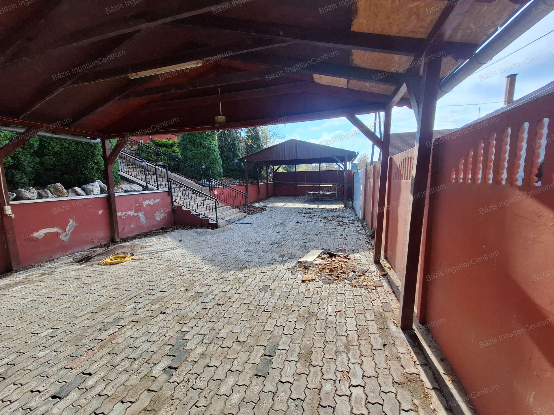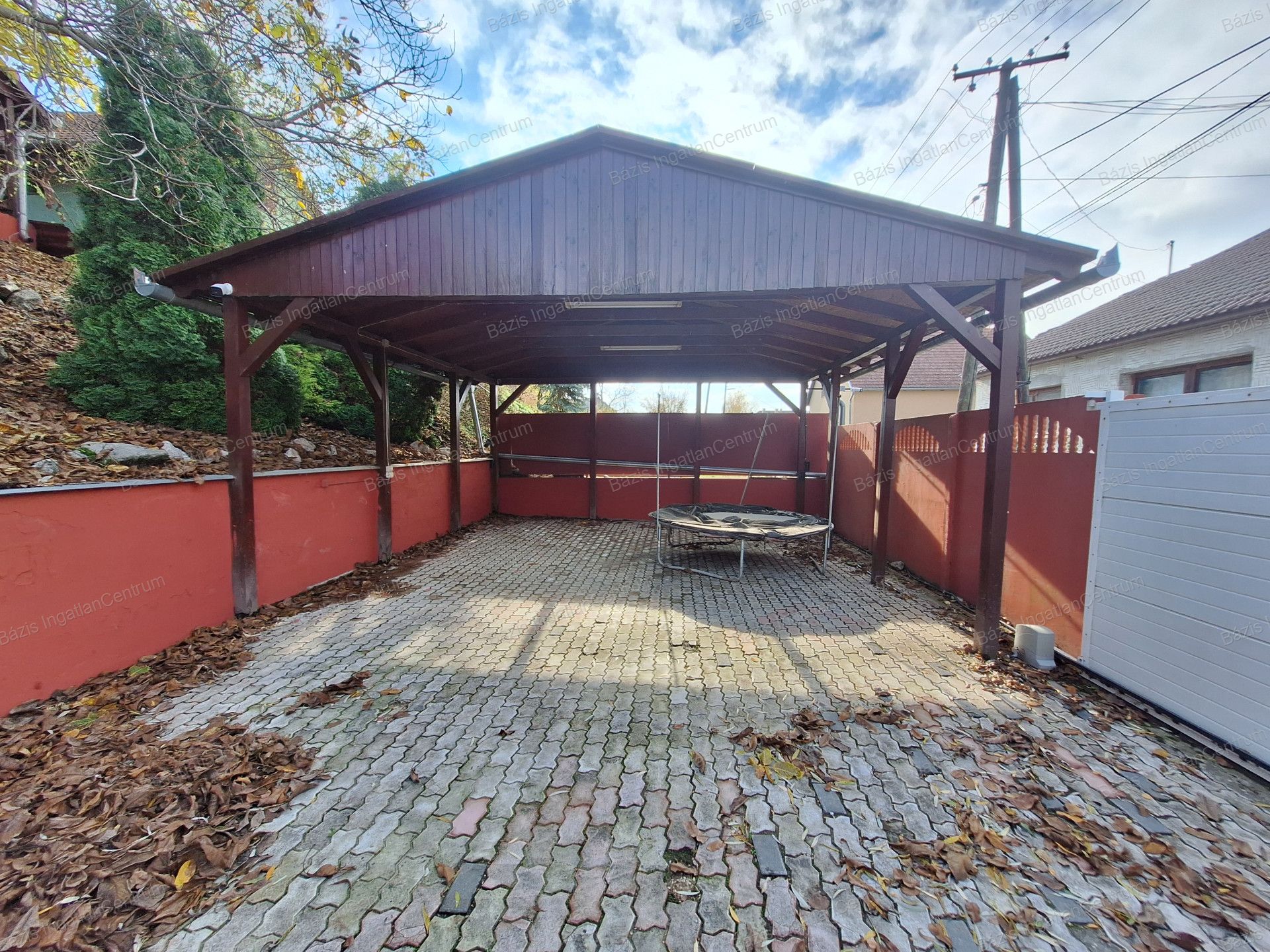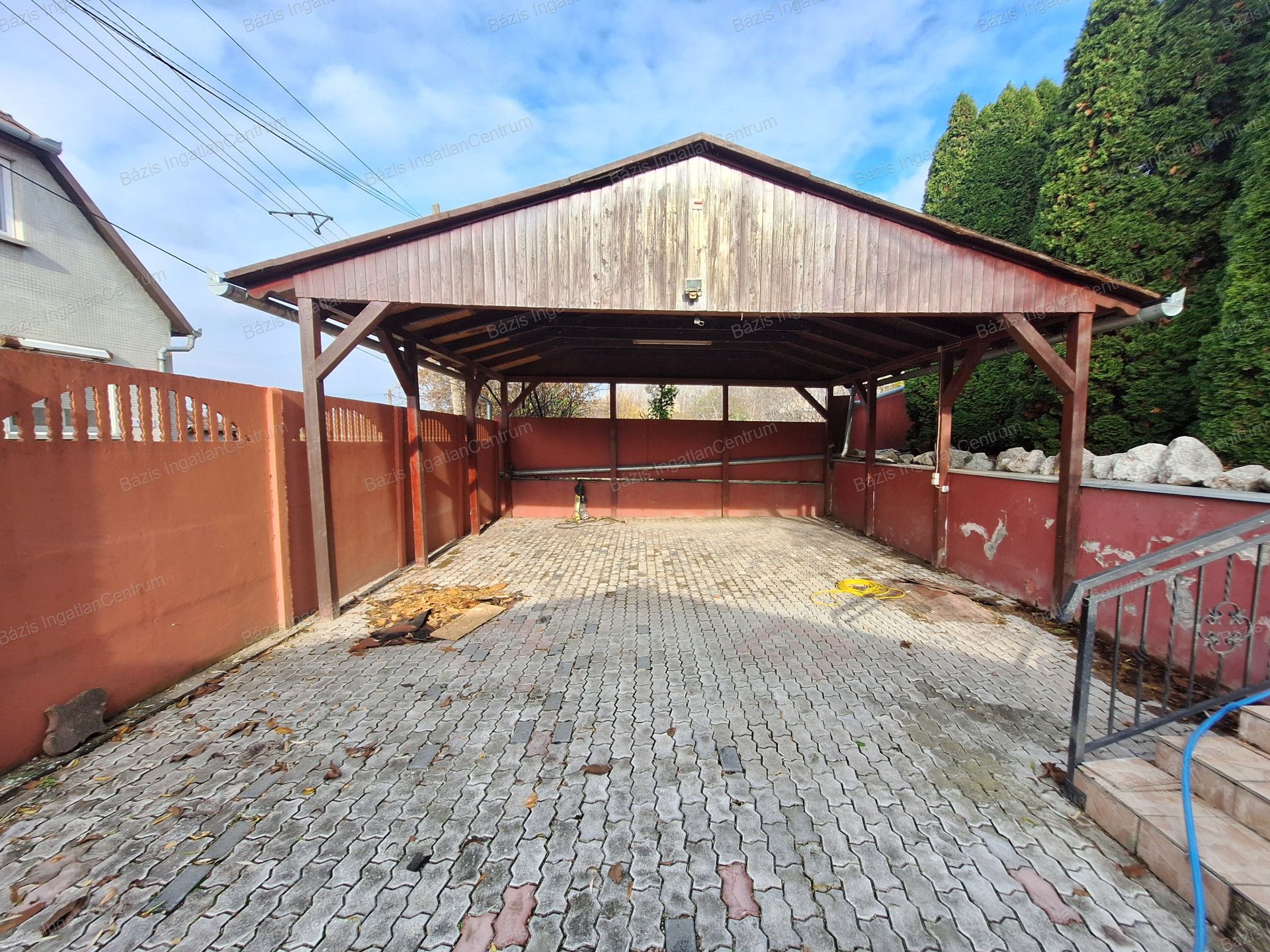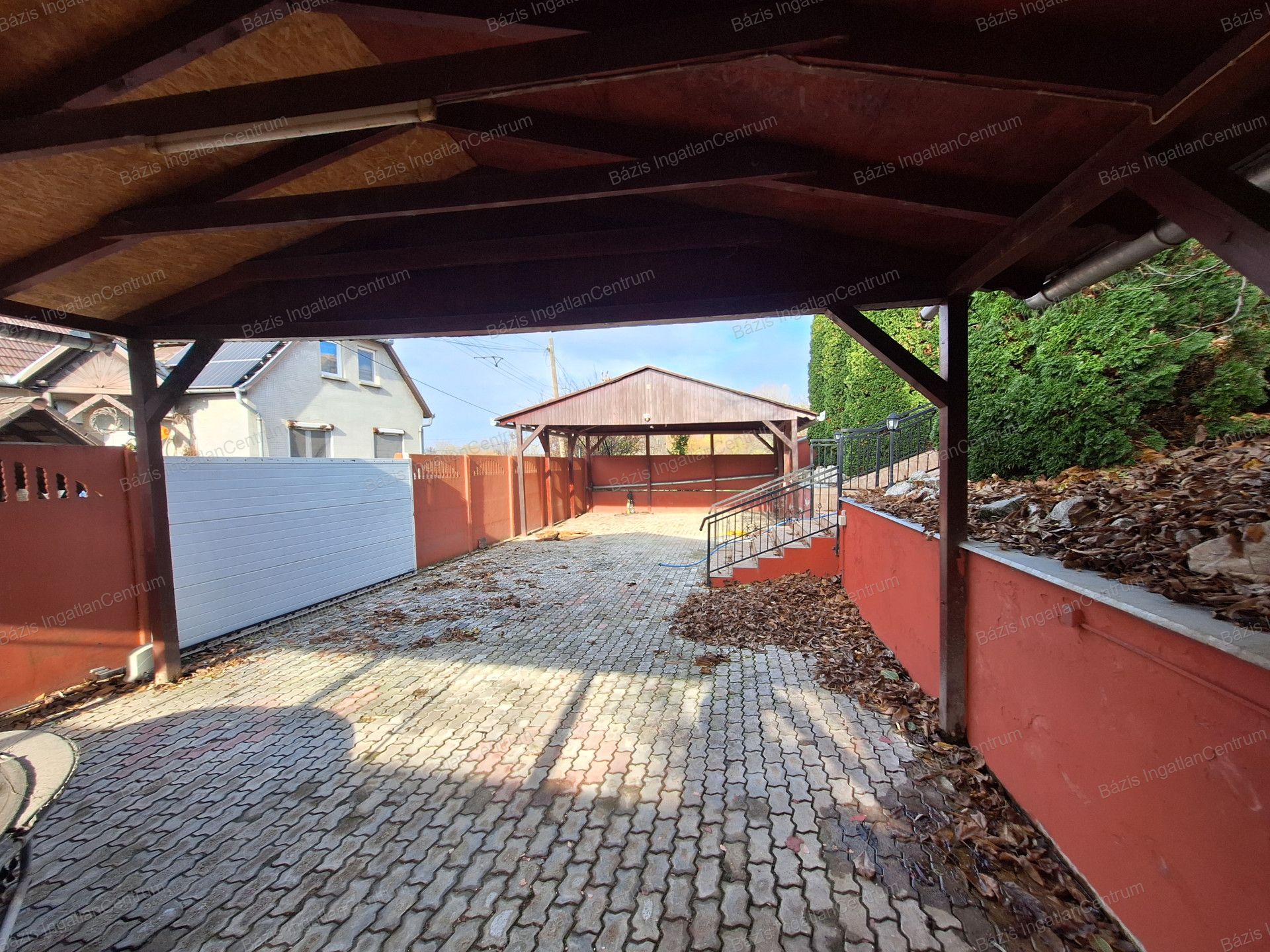 Az ingatlanhoz tartozó 806 m²-es, rendkívül tágas udvar két utcából is megközelíthető, elektromos kapukon keresztül. A gépjárművek számára egy zárt garázs áll rendelkezésre, emellett két fedett beálló is kialakításra került, ahol összesen akár négy kisteherautó is kényelmesen elfér.