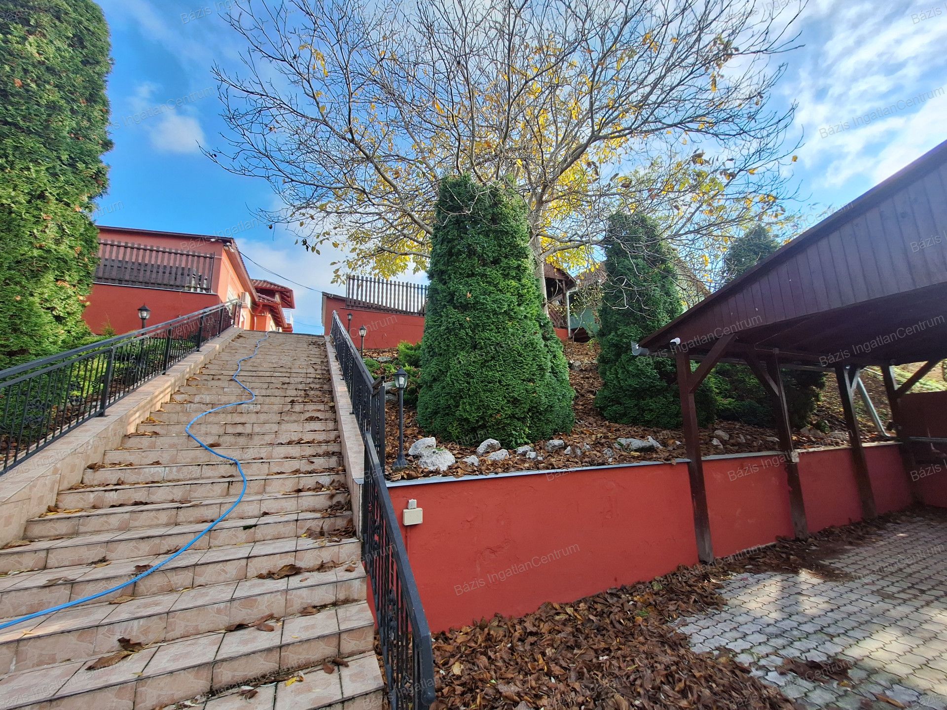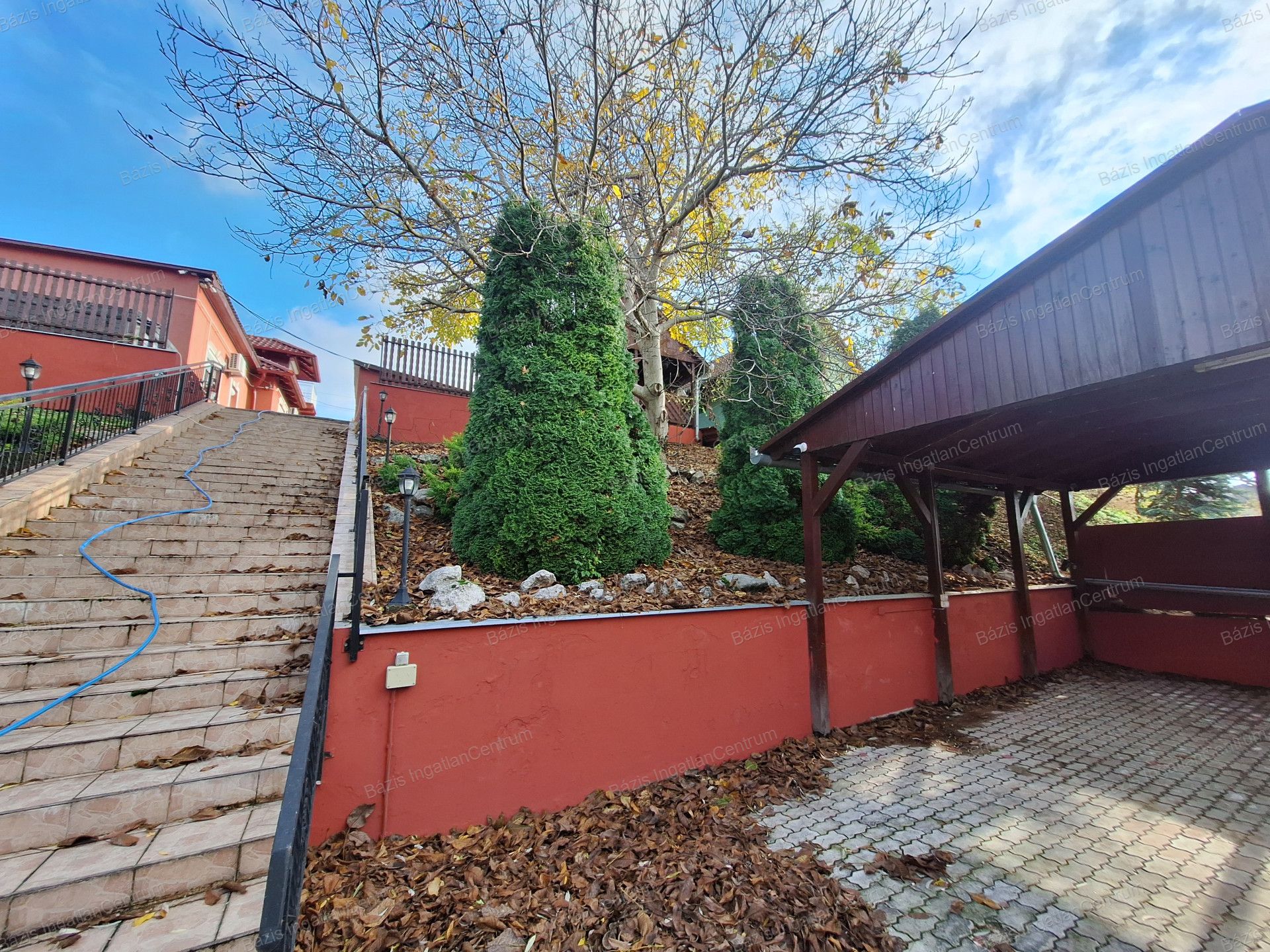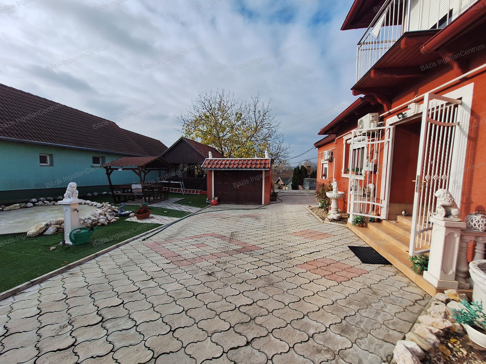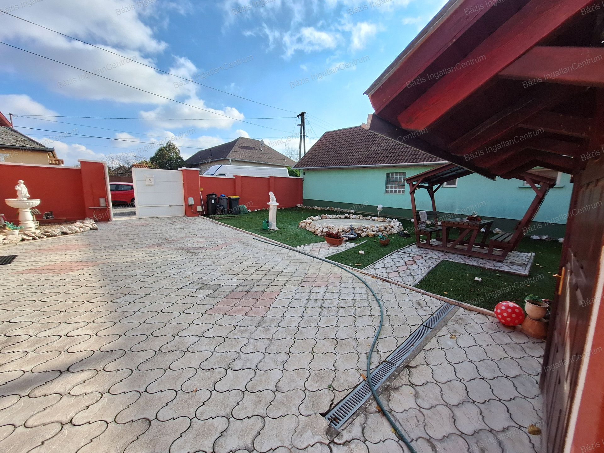 Az ingatlanhoz tartozó 806 m²-es, rendkívül tágas udvar két utcából is megközelíthető, elektromos kapukon keresztül. A gépjárművek számára egy zárt garázs áll rendelkezésre, emellett két fedett beálló is kialakításra került, ahol összesen akár négy kisteherautó is kényelmesen elfér.