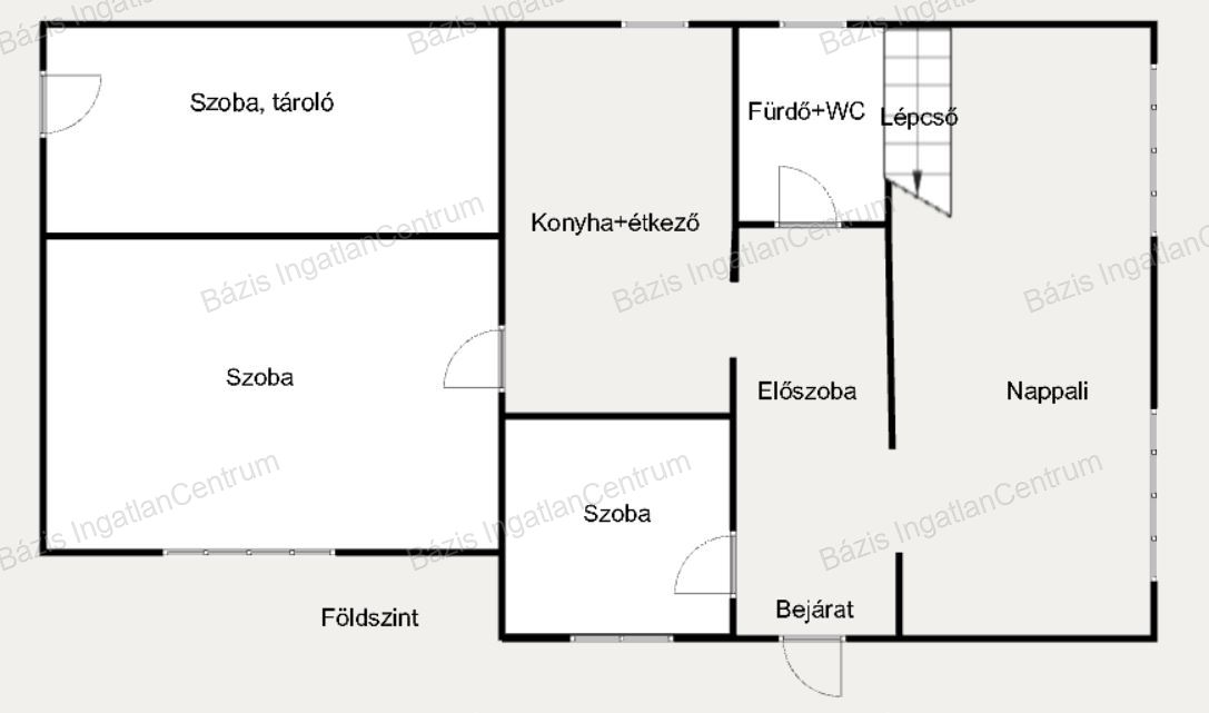 A földszinten tágas, világos nappali, két hálószoba, előszoba, valamint konyha étkezővel található. Az udvarról külön bejárattal rendelkező helyiség jelenleg tárolóként funkcionál, de könnyedén kialakítható vendégszobának vagy dolgozószobának is. A fürdőszoba és a WC egy helyiségben kapott helyet.