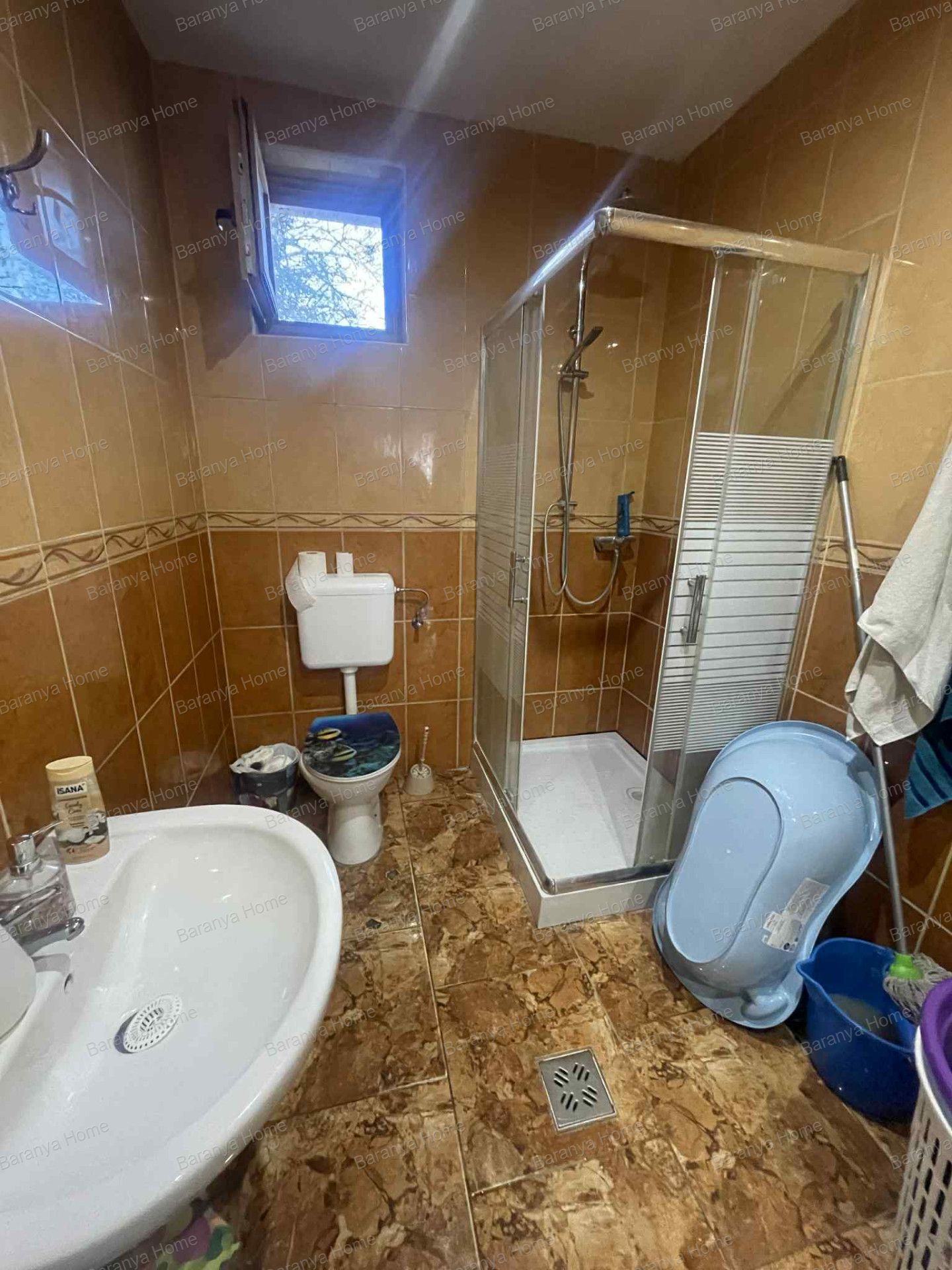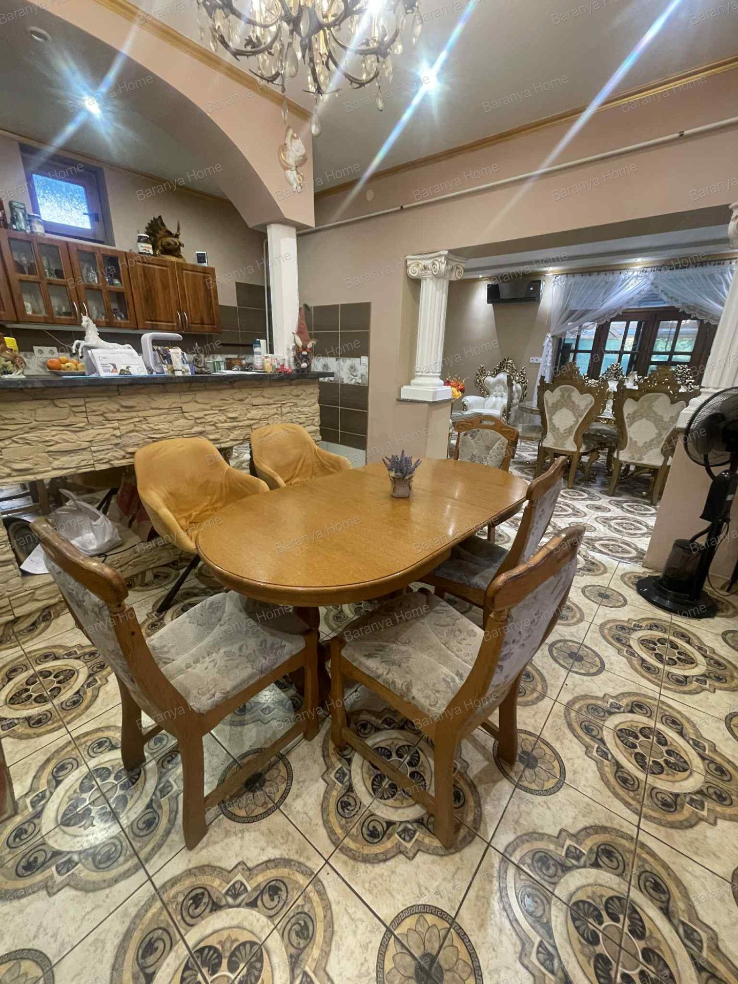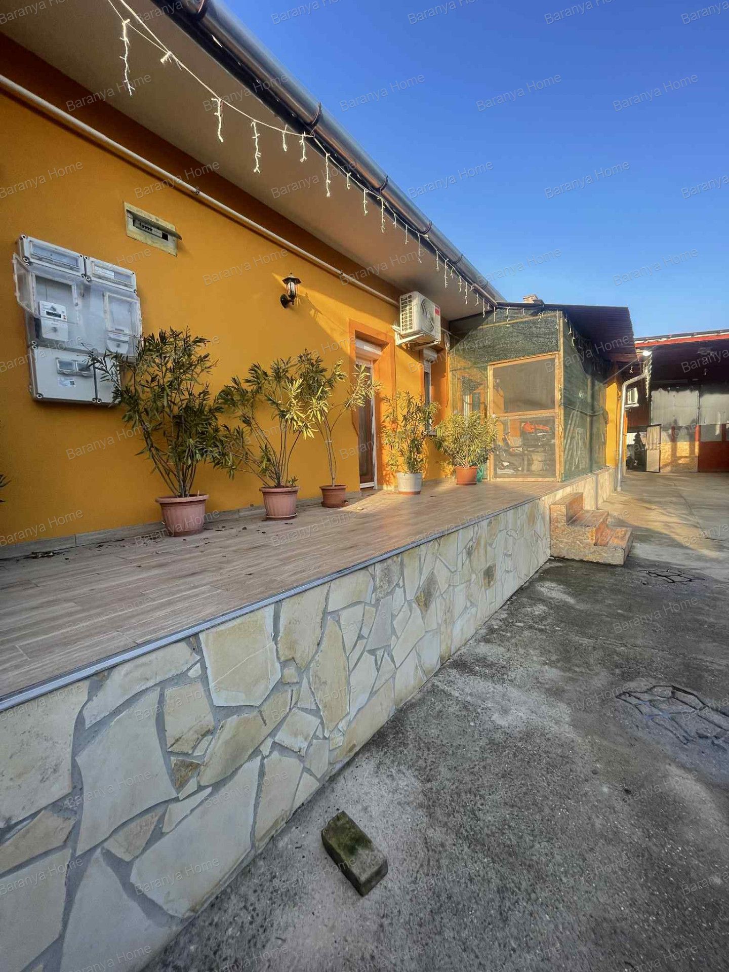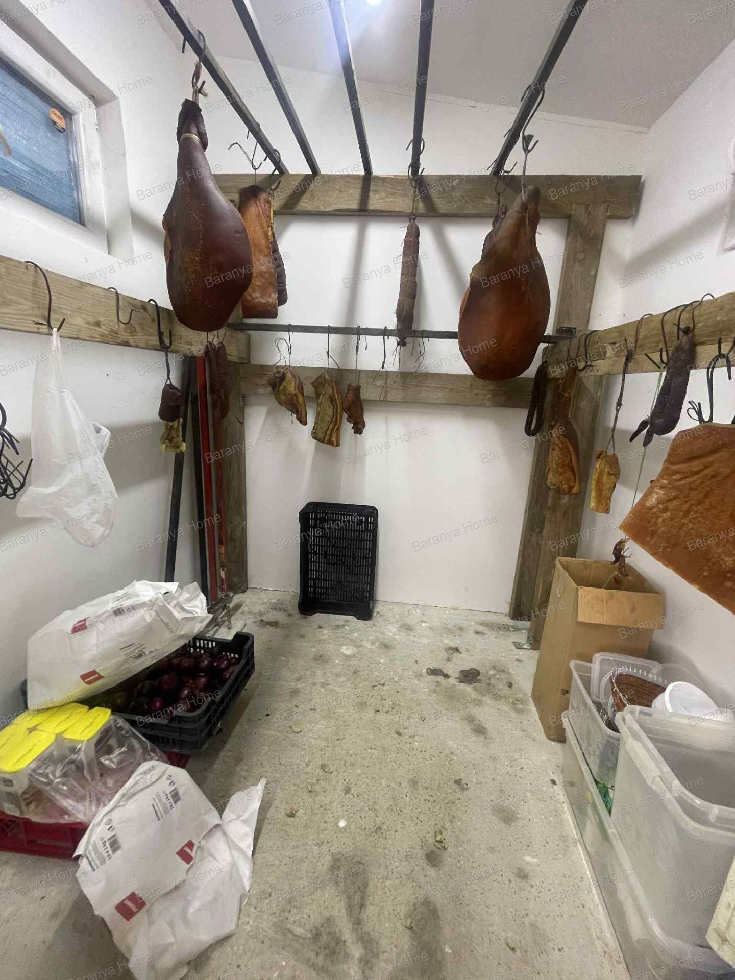 A két lakrészből álló épületeggyüttes nagyobbik részében, 3 szobát, egy előszobát, egy nappalit, egy konyha-étkezőt, egy spájzot, egy fürdőszobát wc-vel és egy nagyméretű, fedett teraszt találunk egy 17 m3-es medencével.