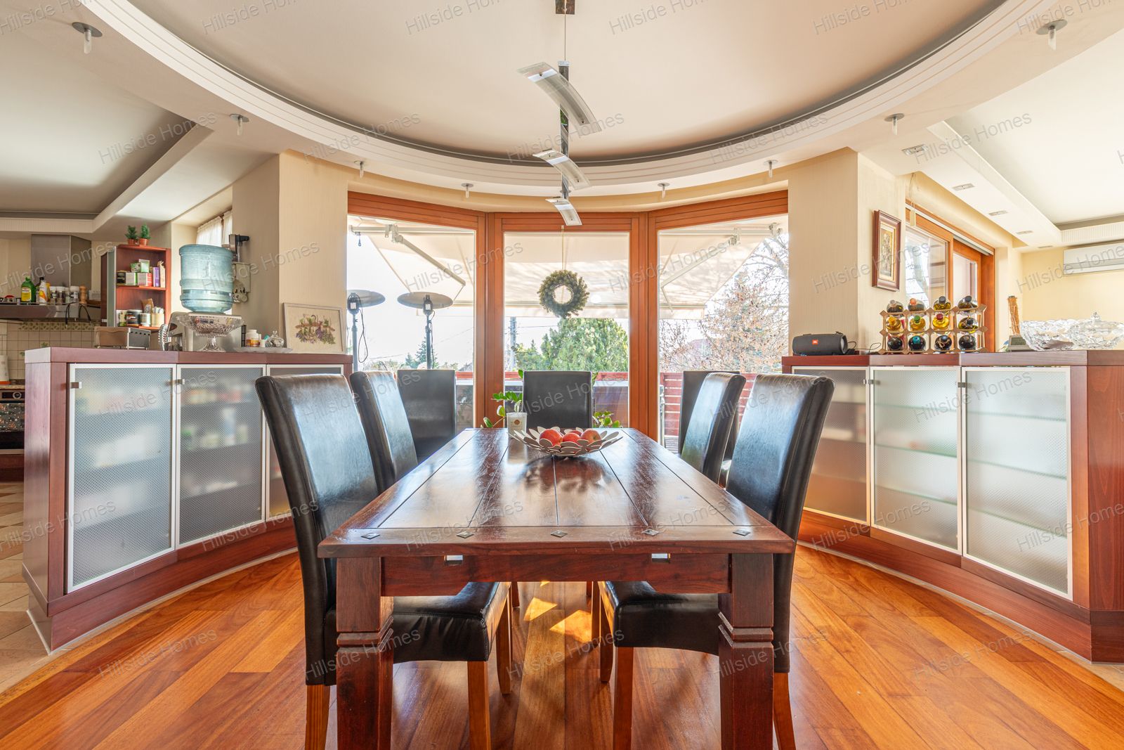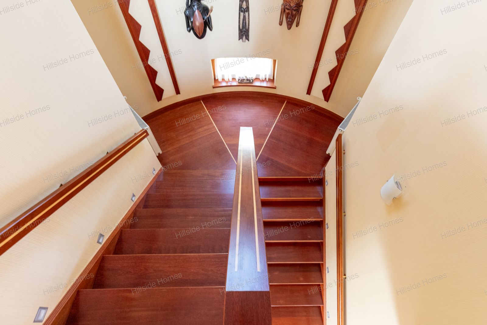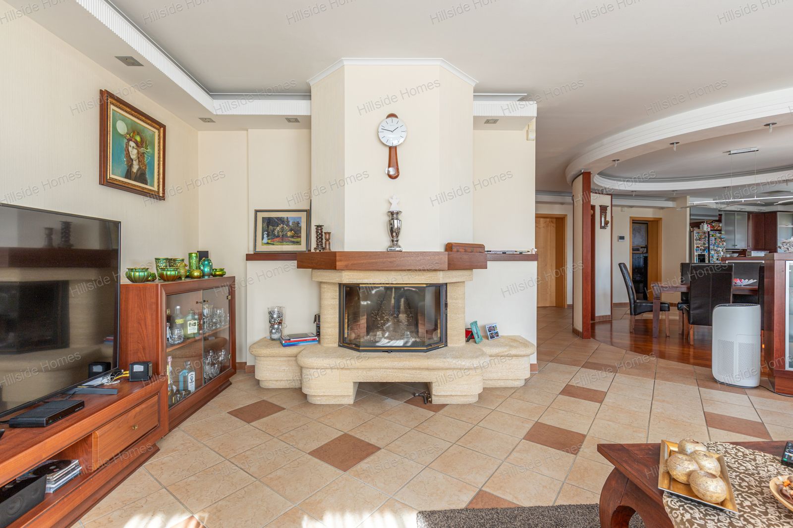 Földszint: Tágas, amerikai konyhás nappali gránit munkapulttal és modern világítással. Az étkező íves kialakítása egyedi atmoszférát teremt, a kandalló pedig meghitt hangulatot biztosít. Innen nyílik kijárat a közel 50 m²-es, panorámás teraszra, ahol kültéri jakuzzi és pihenőbútorok kaptak helyet. Külön dolgozószoba is rendelkezésre áll.