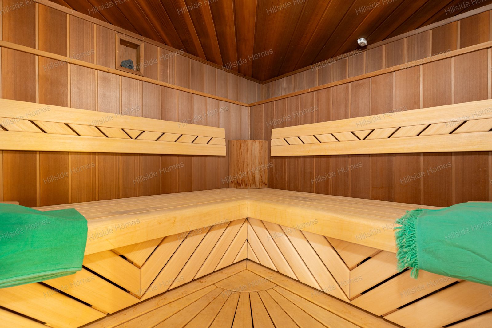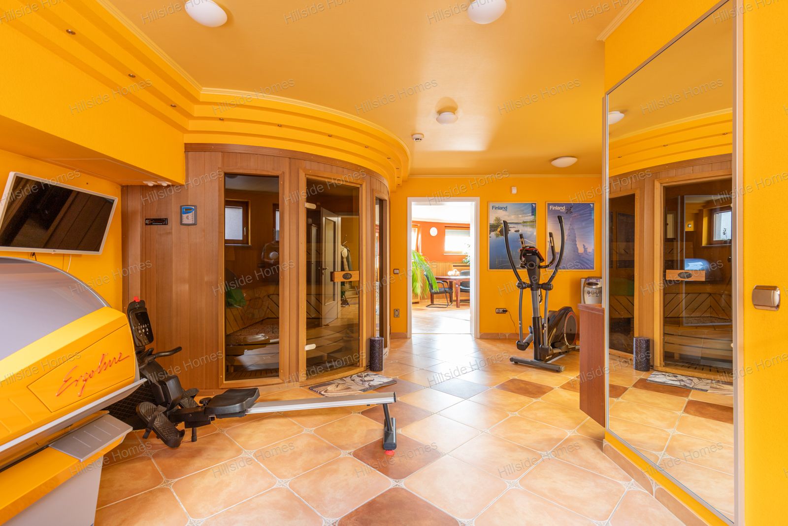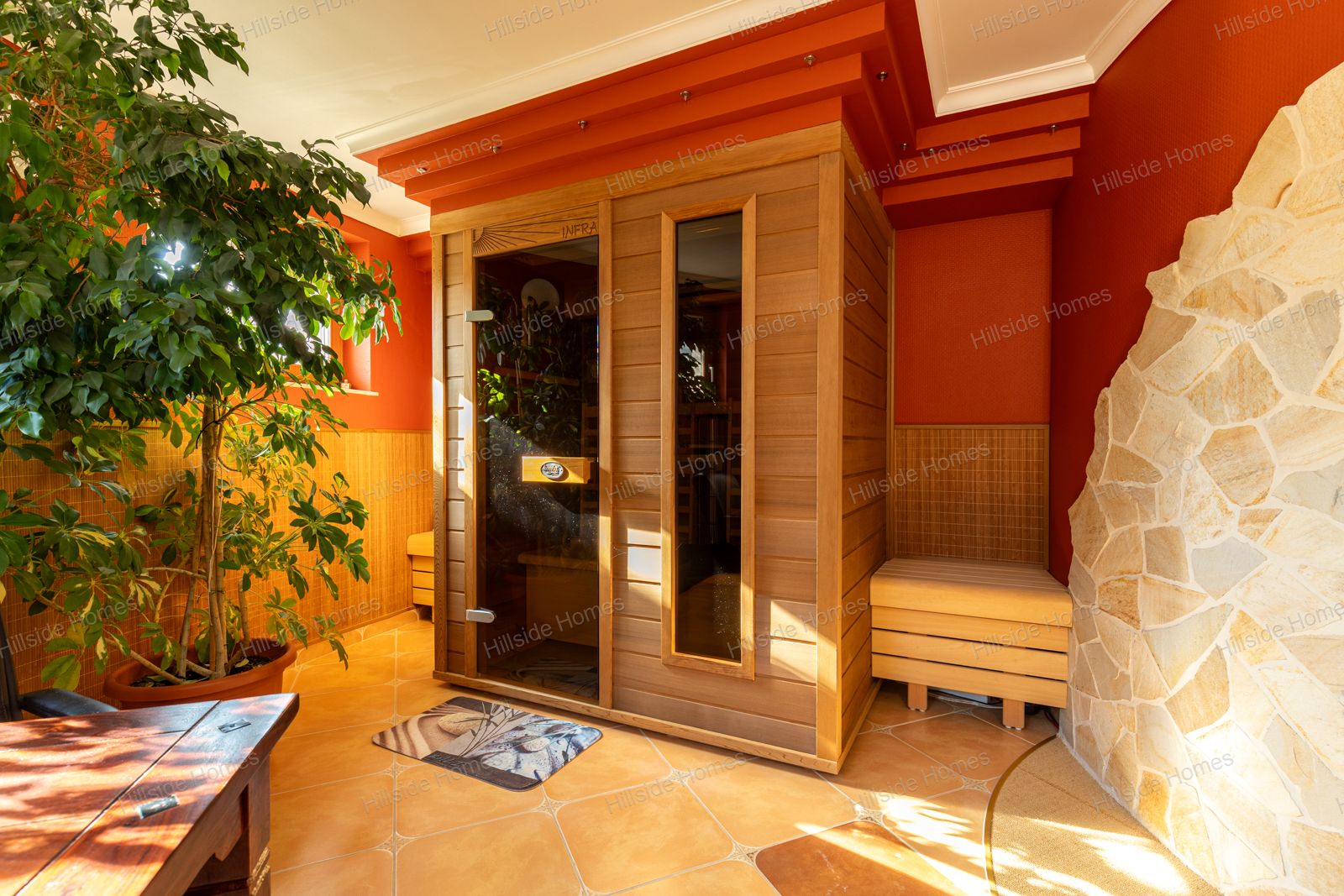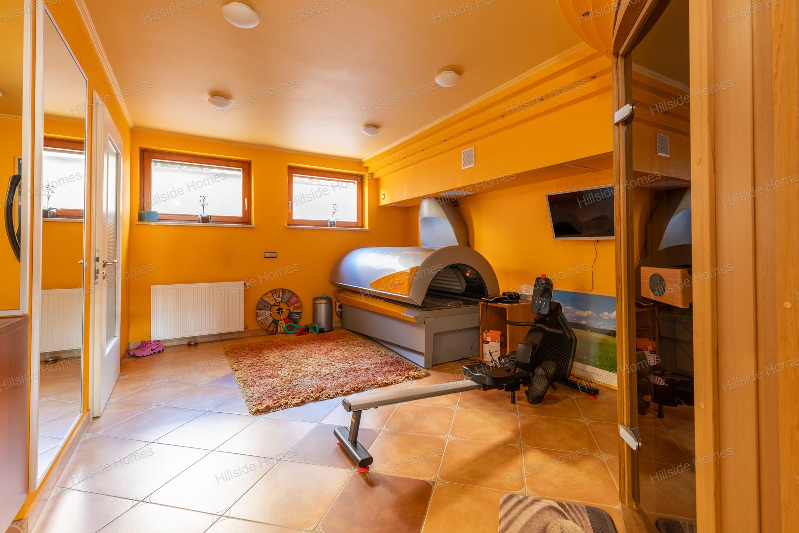 Alsó szint: Saját wellness-részleg jakuzzival, infra- és finn szaunával, szoláriummal és pihenősarokkal. Emellett bársarok, tárolóhelyiségek, mosókonyha és gépészeti helyiség.