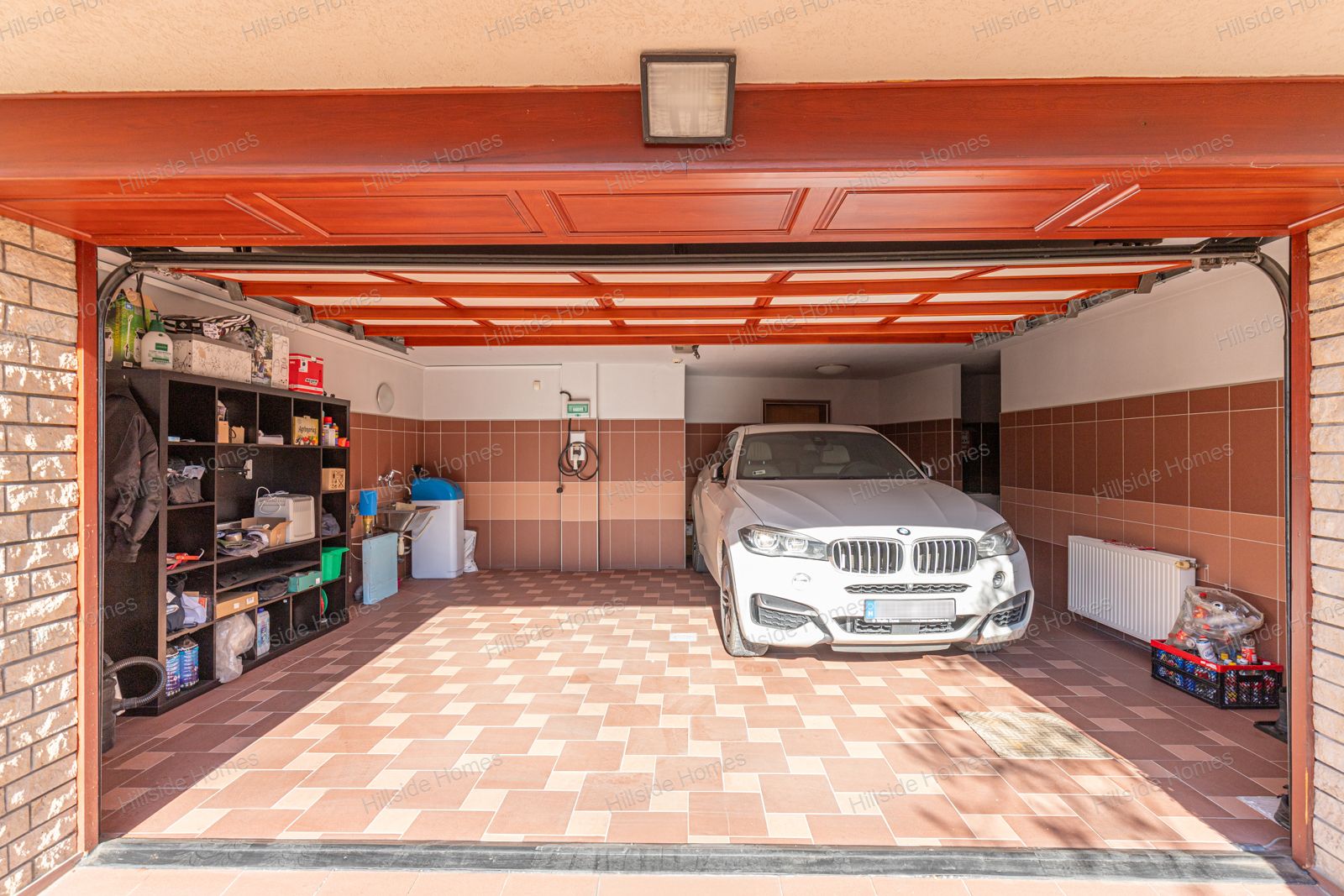 A 40 m²-es, fűthető dupla garázs jégmentesíthető lehajtóval egész évben kényelmes használatot biztosít. Az udvarban további parkolóhelyek állnak rendelkezésre.