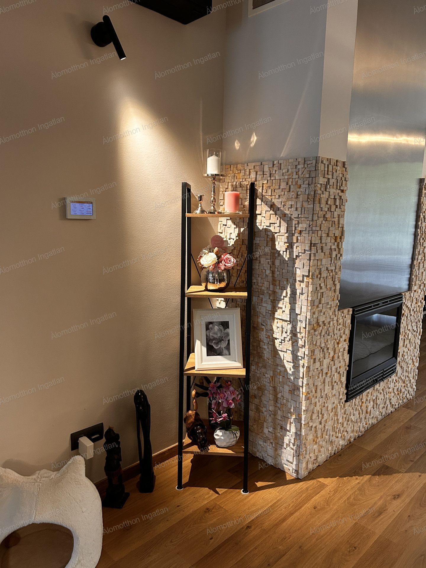 Előszoba-étkező-tágas amerikai konyha, nappaliban-kandalló, a nappaliból kilehet menni a fedett teraszra
