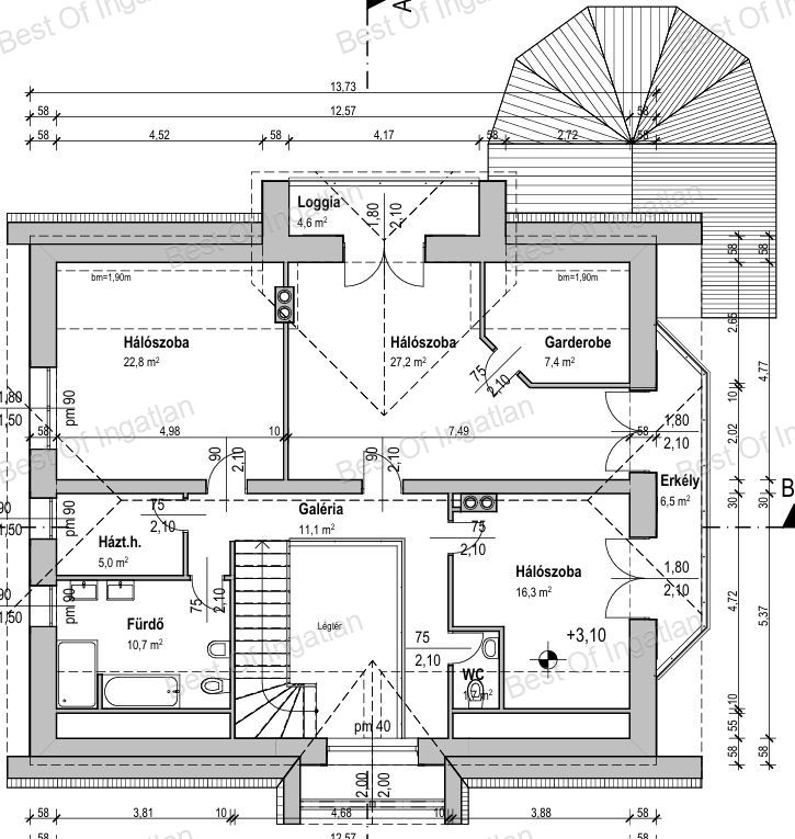 Világos, kényelmesen használható galéria, 3 kellemes méretű hálószoba (egyik gardróbbal rendelkezik) - ebből 2 szoba erkélykapcsolattal (4,6 m2 + 6,5 m2), a fiatalos fürdőszoba fürdőkádas, zuhanyzós, bidével és wc-vel felszerelt, mosókonyha, külön WC