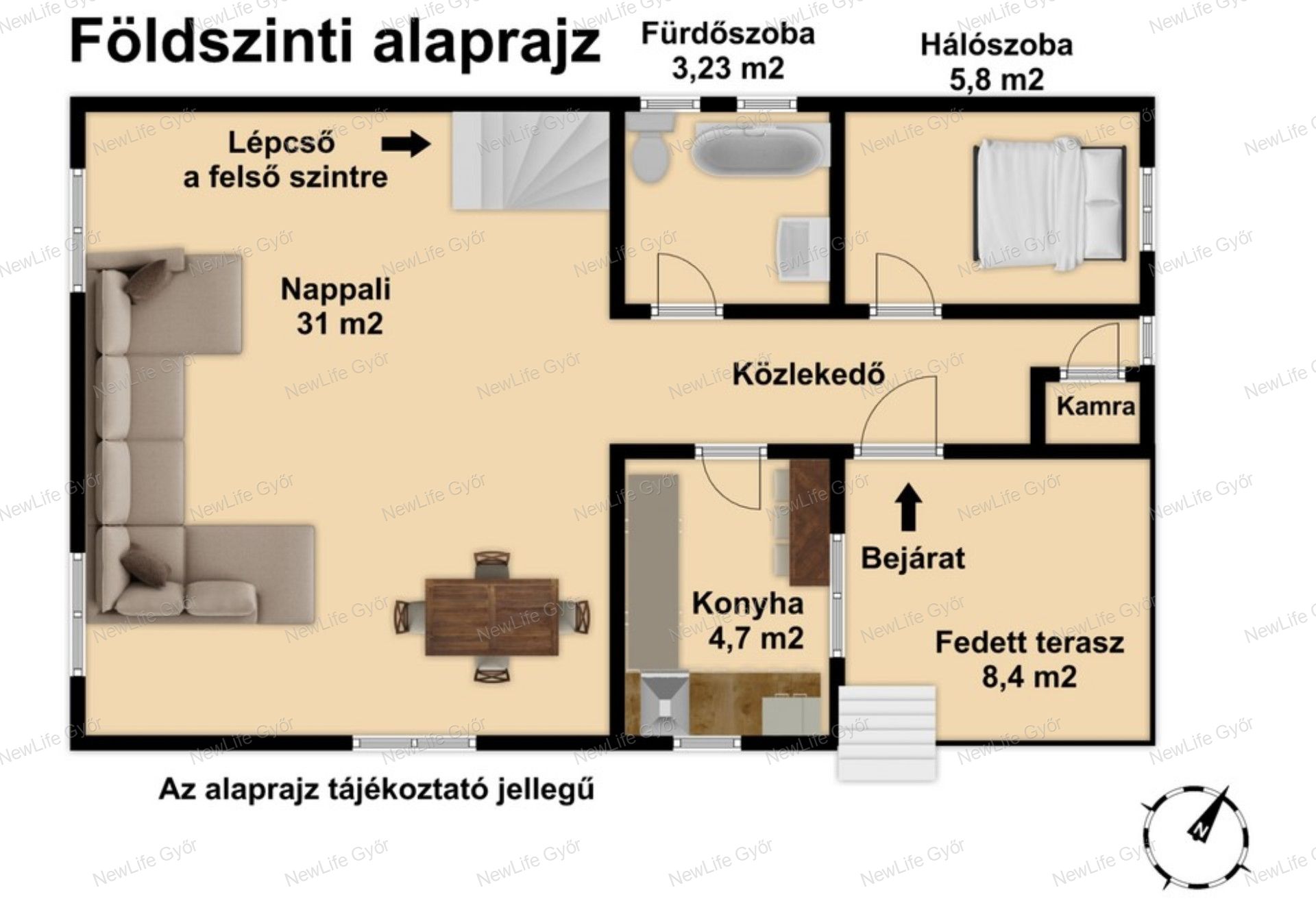 A lakóházba egy fedett, kb 8 m2-es teraszon keresztül léphetünk be. Az alapterület bruttó 71 (nettó: 60 m2). Tetőtér bruttó: 51 (hasznos: kb 20 m2)