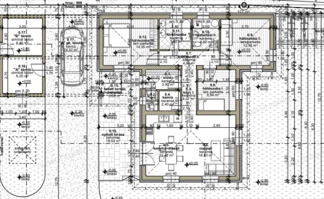 "A" ház a telek első részén helyezkedik el, 493 m2-es saját telekrésszel, kb. 18 m utcafronttal rendelkezik.