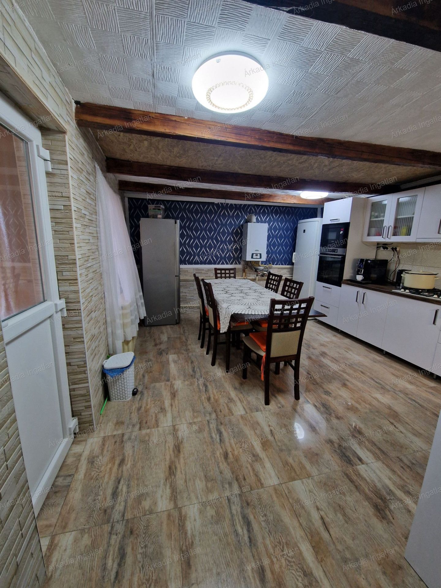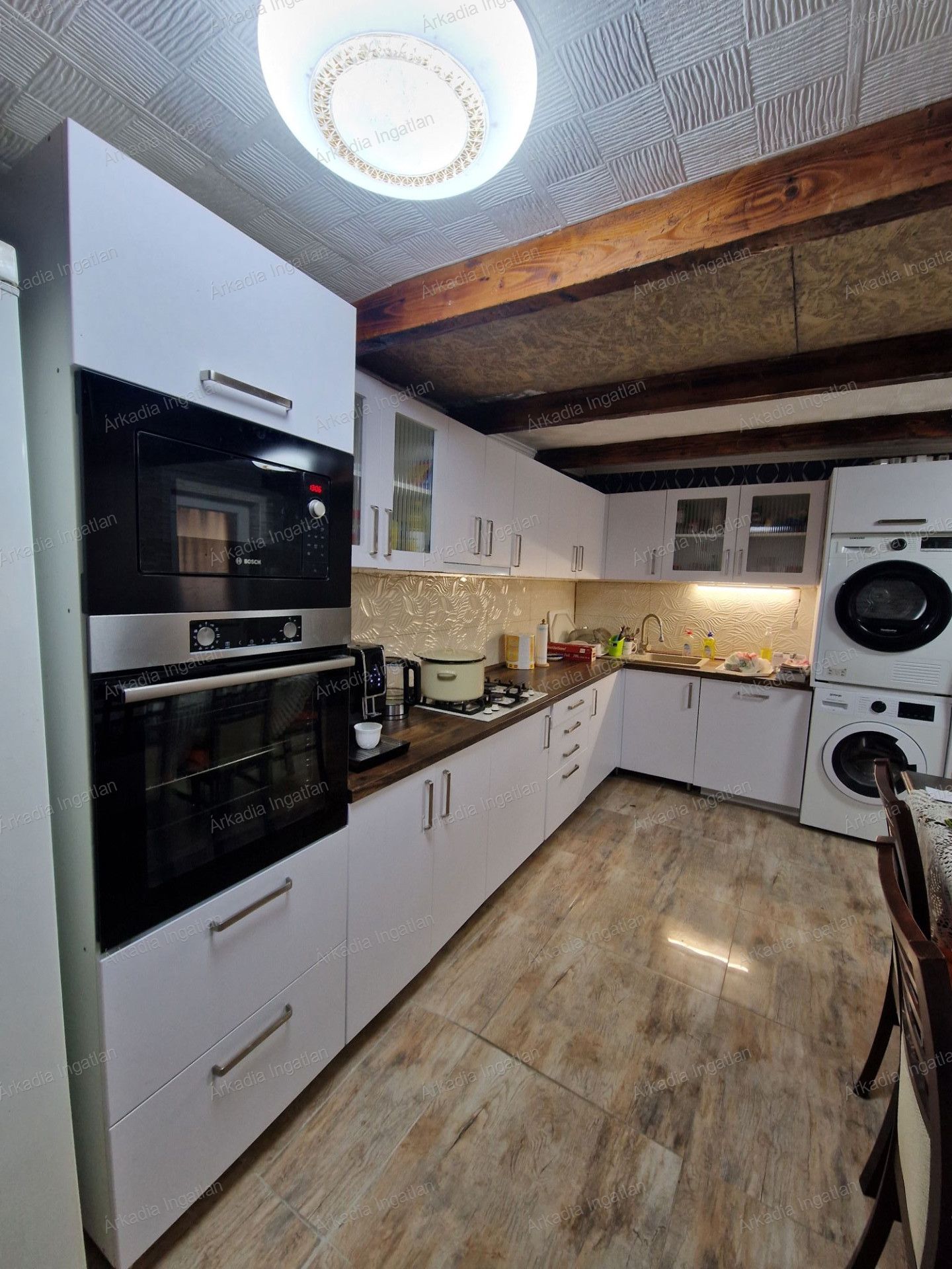 -A burkolatok nagy méretű járólap a konyhában, nappaliban, fürdőszobákban,