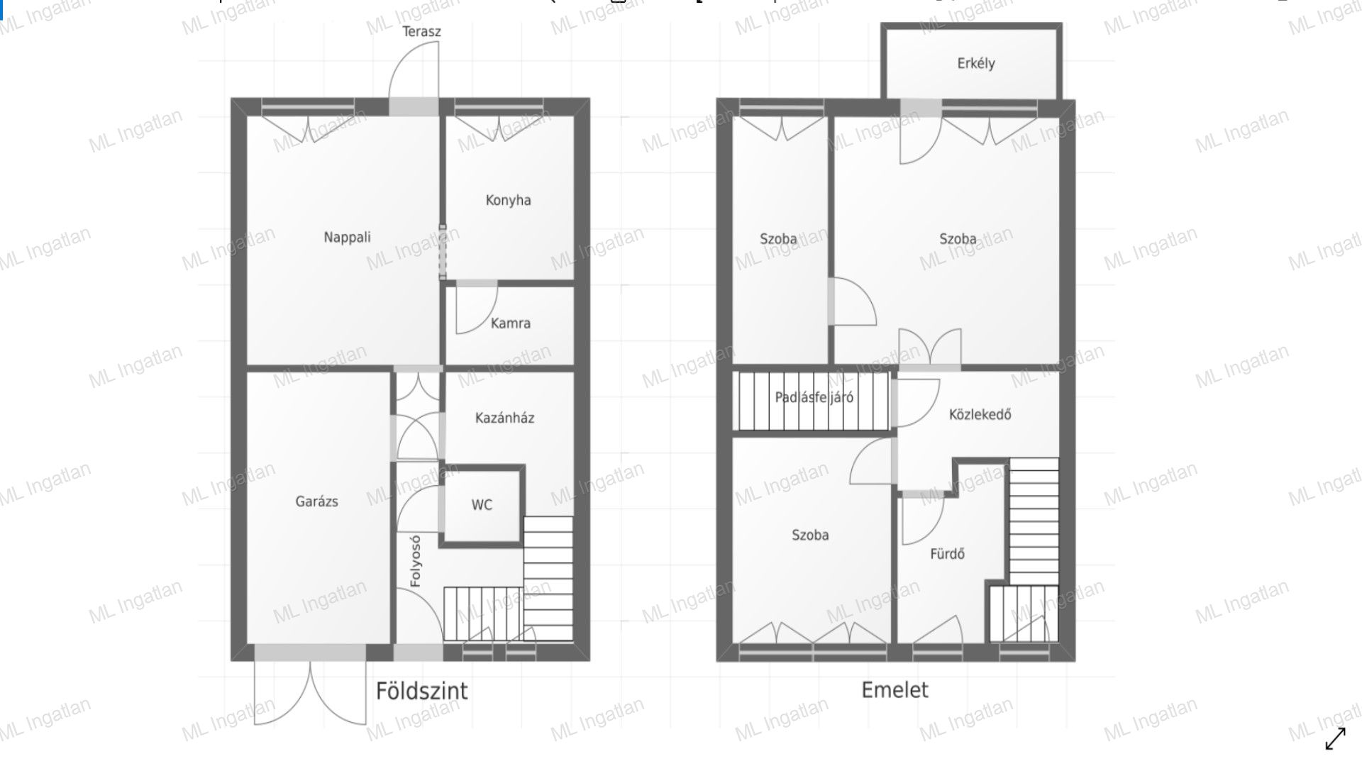 Az emelet szintén 75 négyzetméter alapterületű, amin két kisebb hálószoba és egy nappali melletti fürdőszoba is található.