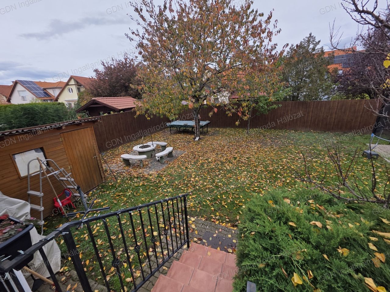 A 439 m²-es, szépen karbantartott és parkosított kert igazi nyugalomsziget. A telek hátsó részén automata locsolórendszer működik, a ház előtti részen pedig térkövezett gépkocsibeálló biztosít kényelmes parkolást akár több autó számára is, a házhoz tartozik továbbá egy tágas, kb. 30 m²-es garázs.