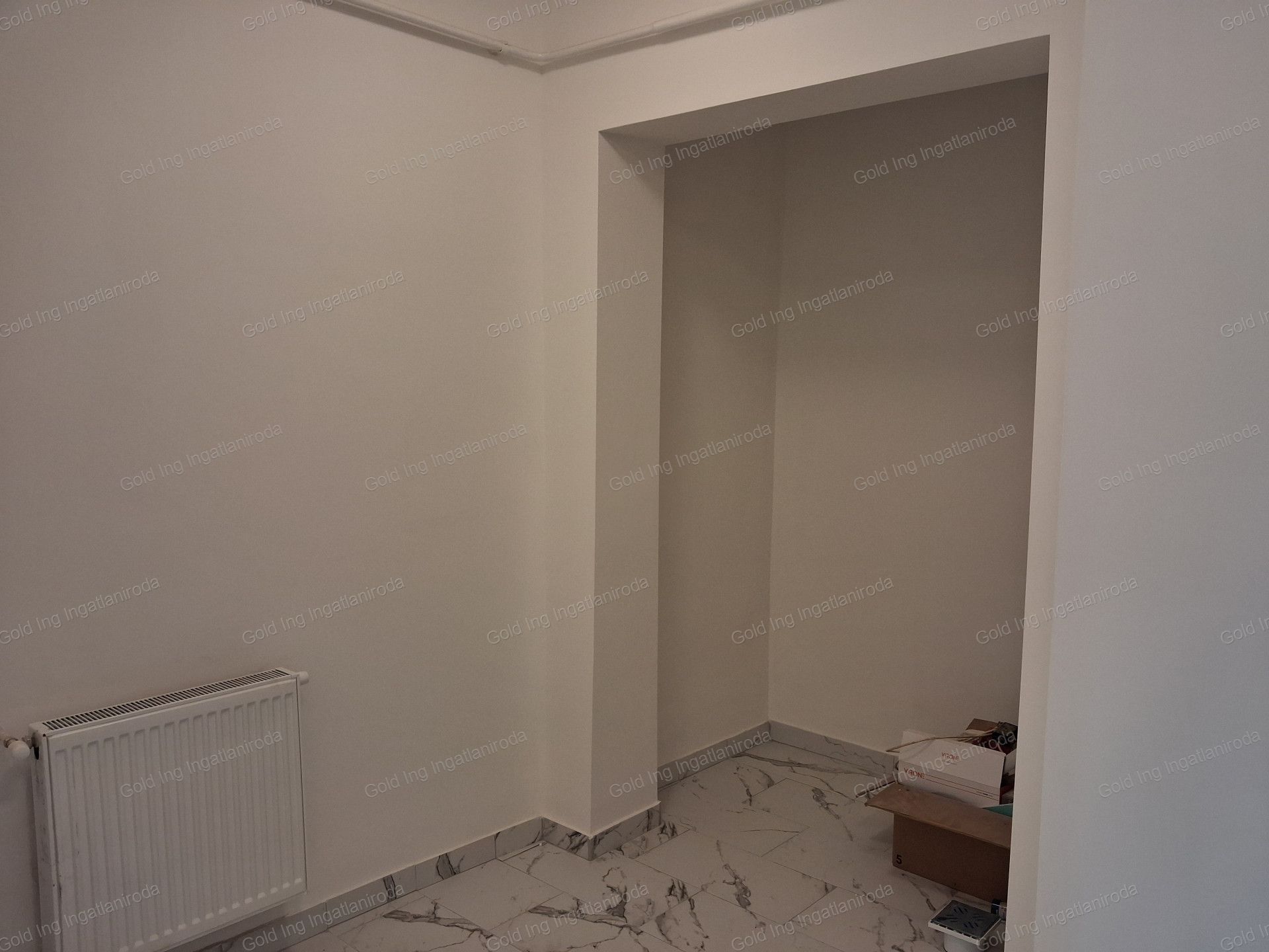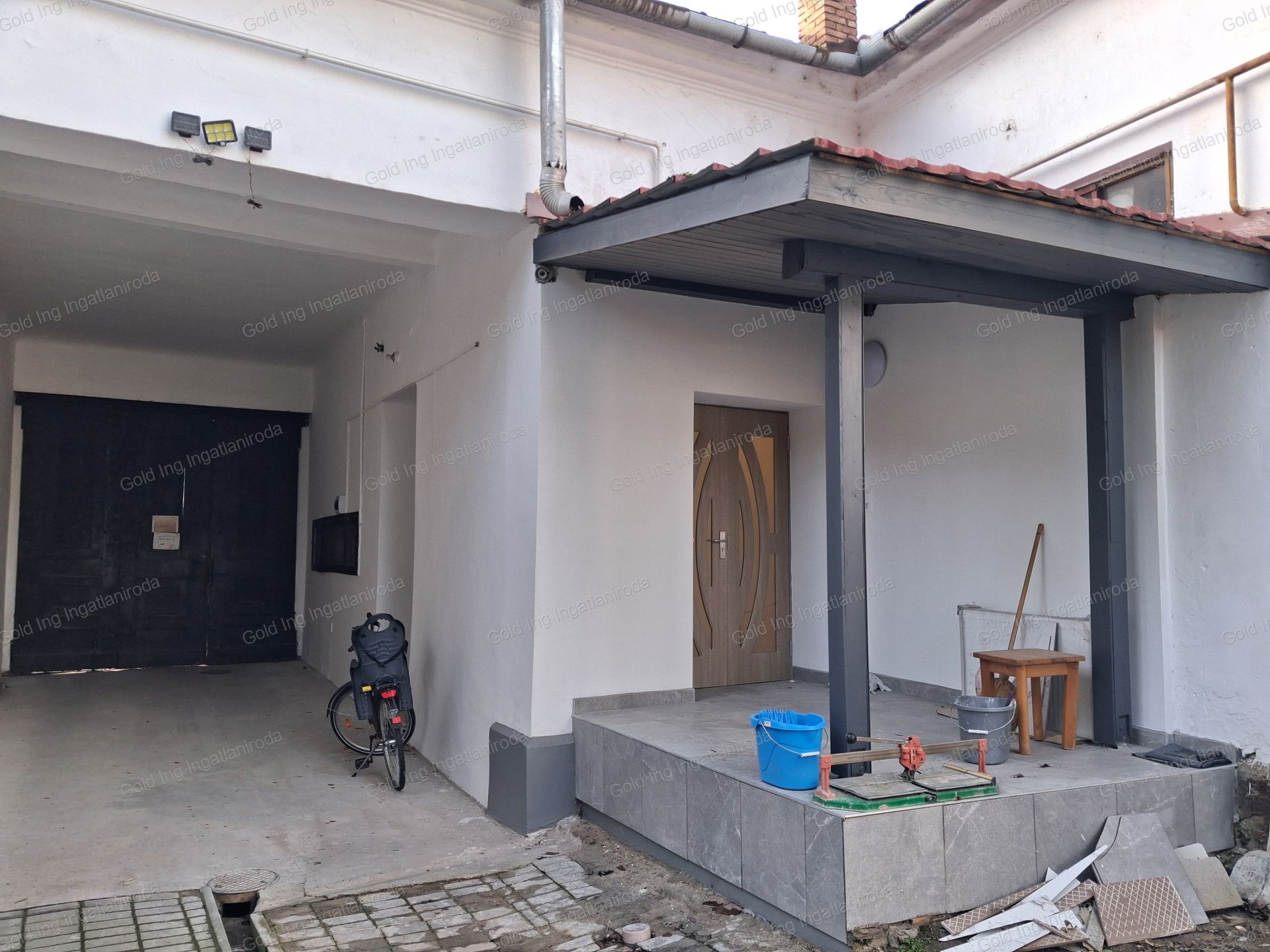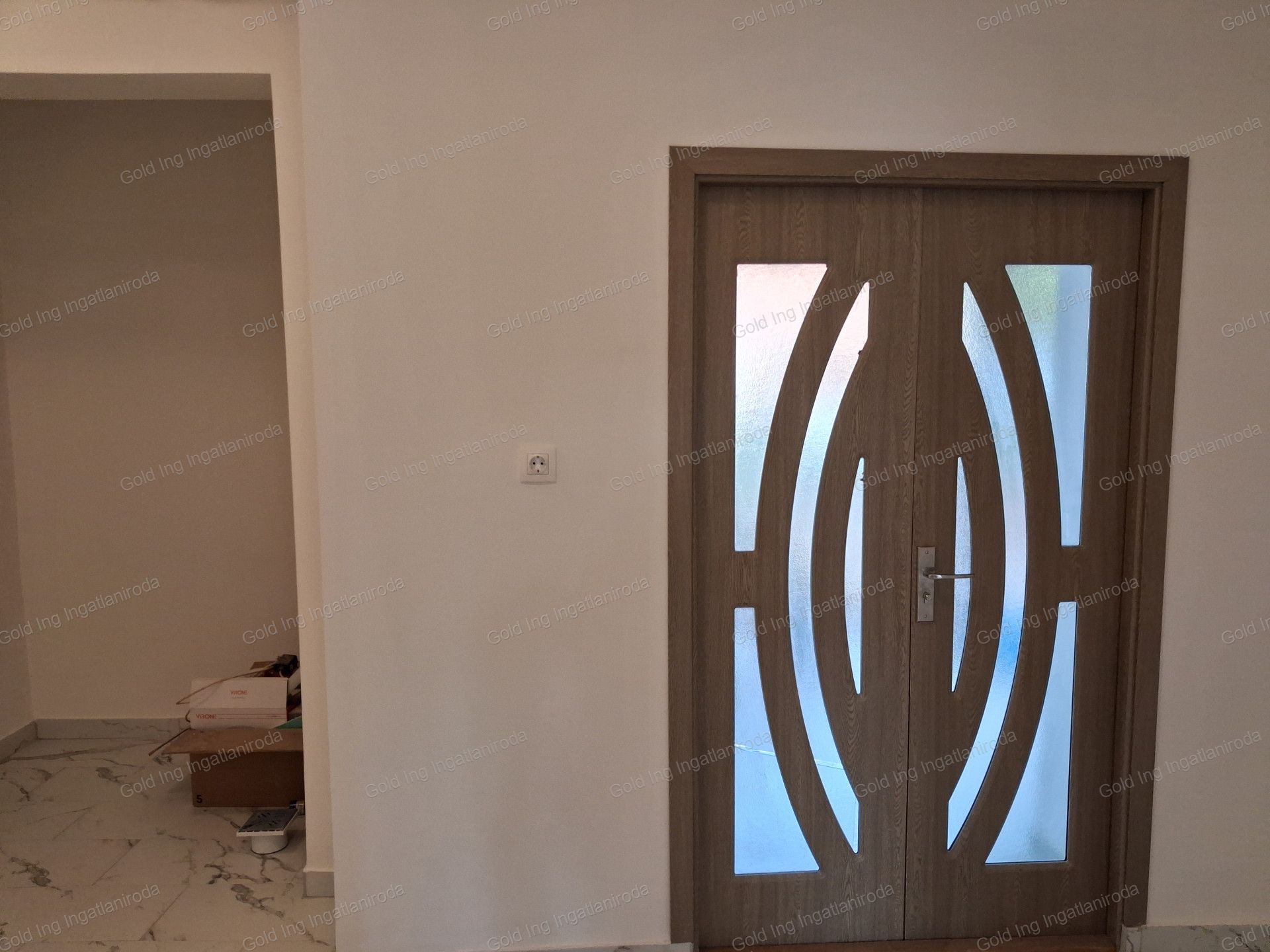 A külső és belső nyílászárók egyaránt vadonatújak. Az étkezős konyhát össze lehet nyitni a terasszal, egy kétszárnyas ajtó választja el őket egymástól. A terasz szépen burkolt, és fedett, divatos középszürke árnyalatban.