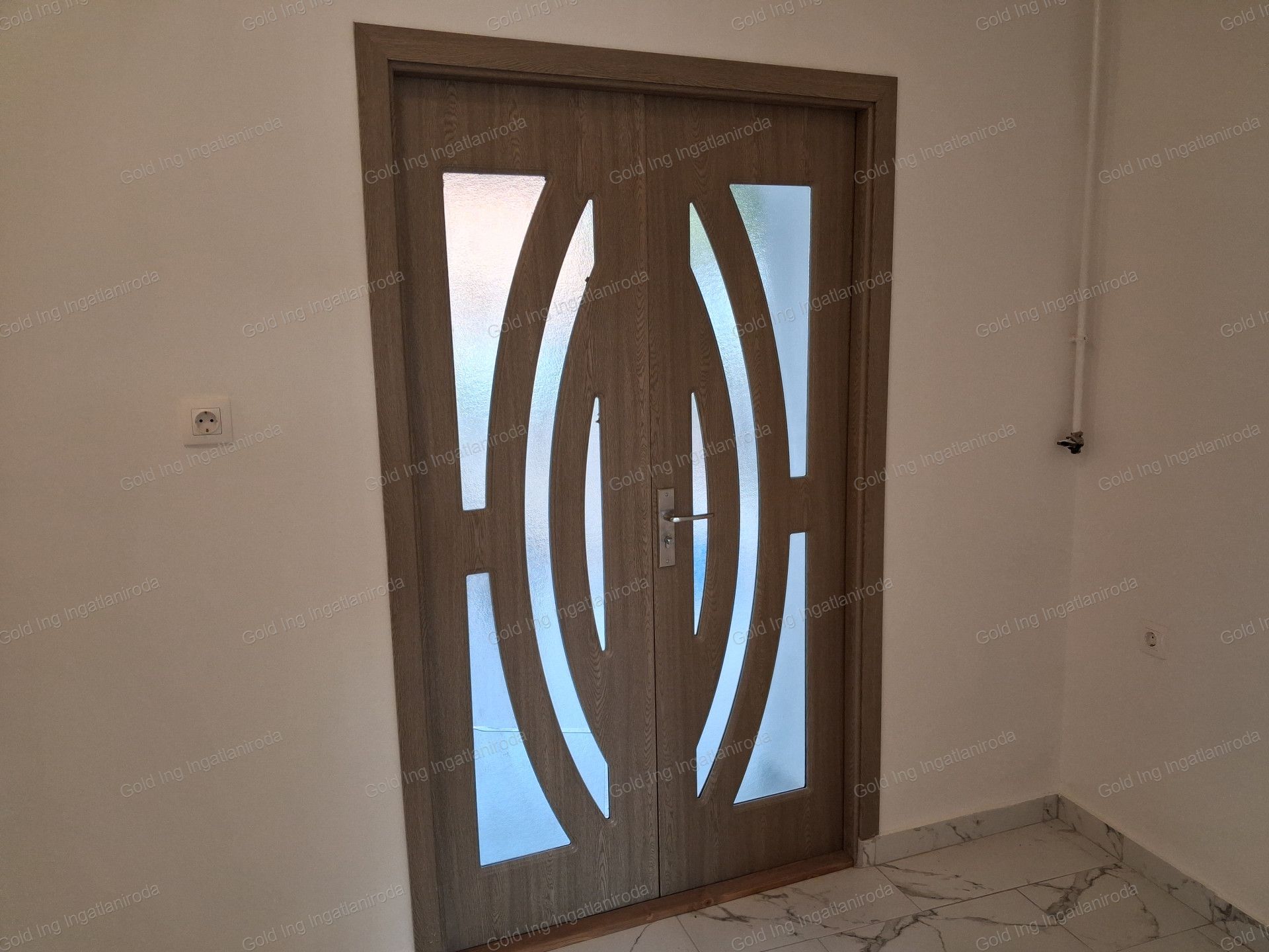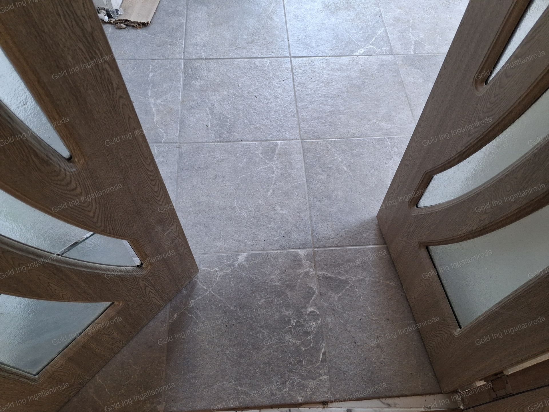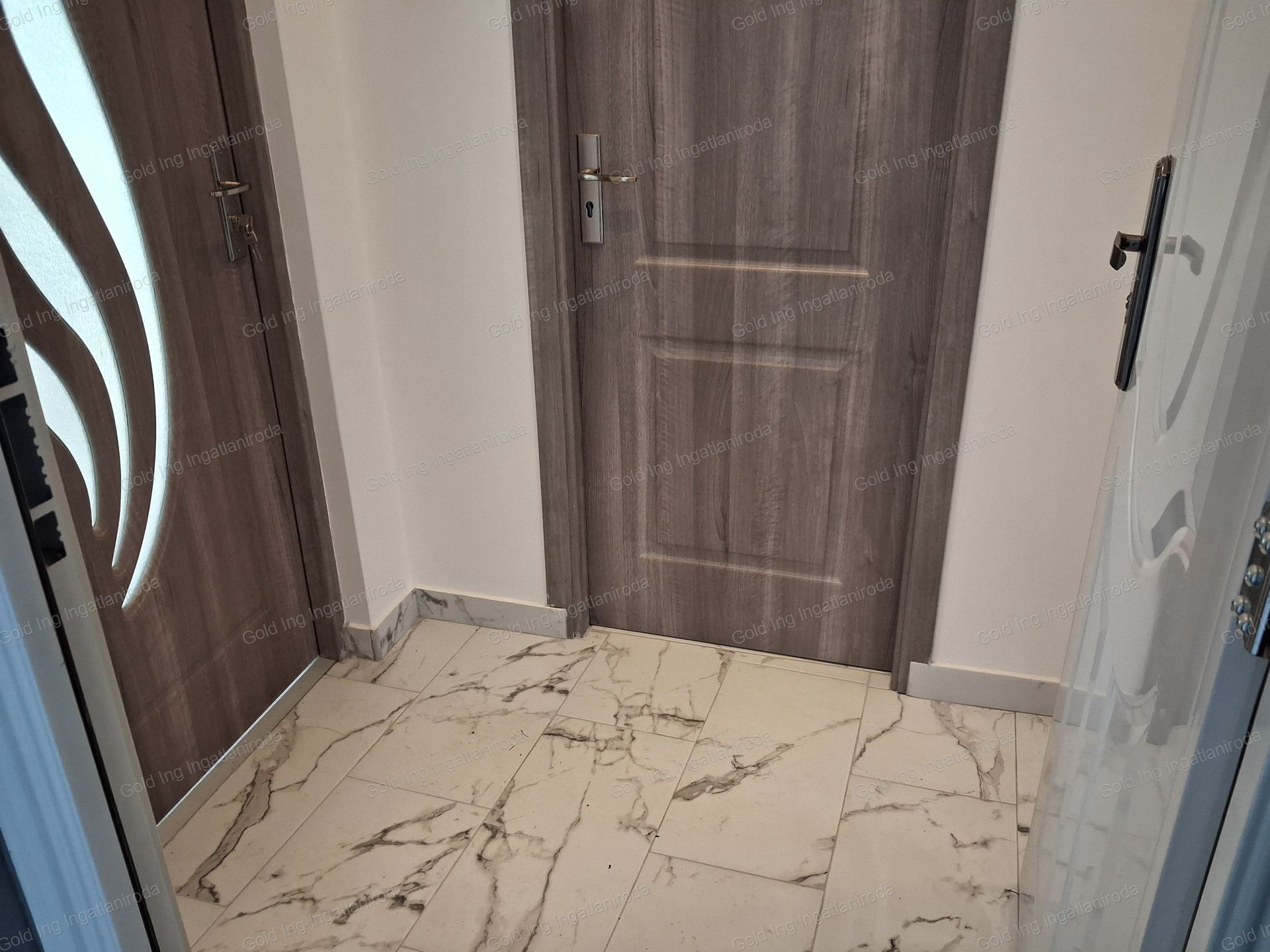 A külső és belső nyílászárók egyaránt vadonatújak. Az étkezős konyhát össze lehet nyitni a terasszal, egy kétszárnyas ajtó választja el őket egymástól. A terasz szépen burkolt, és fedett, divatos középszürke árnyalatban.