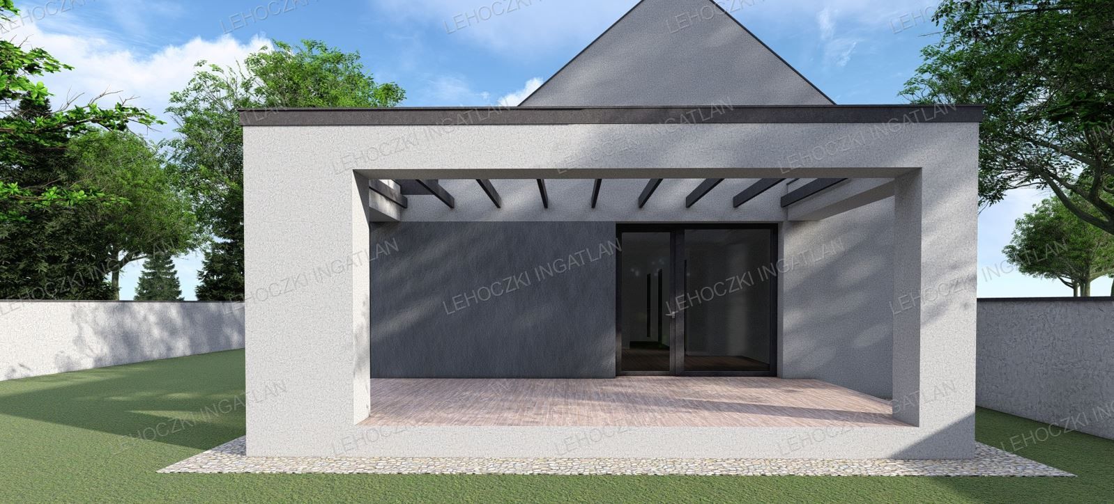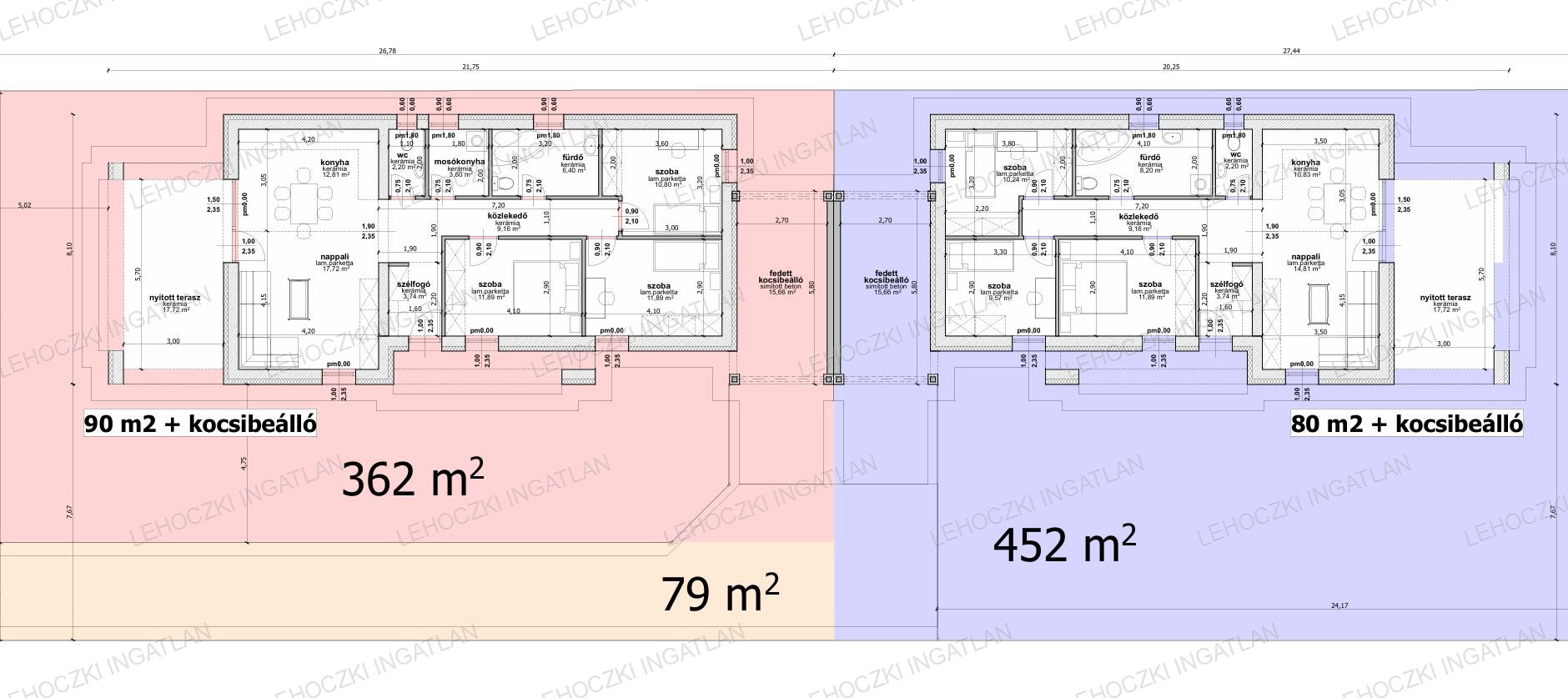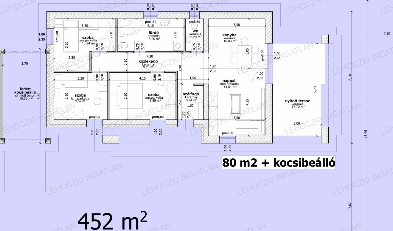Lakótér 80 nm + 15,66 nm fedett kocsibeálló, melyhez tartozik egy 17,72 nm-es nyitott terasz