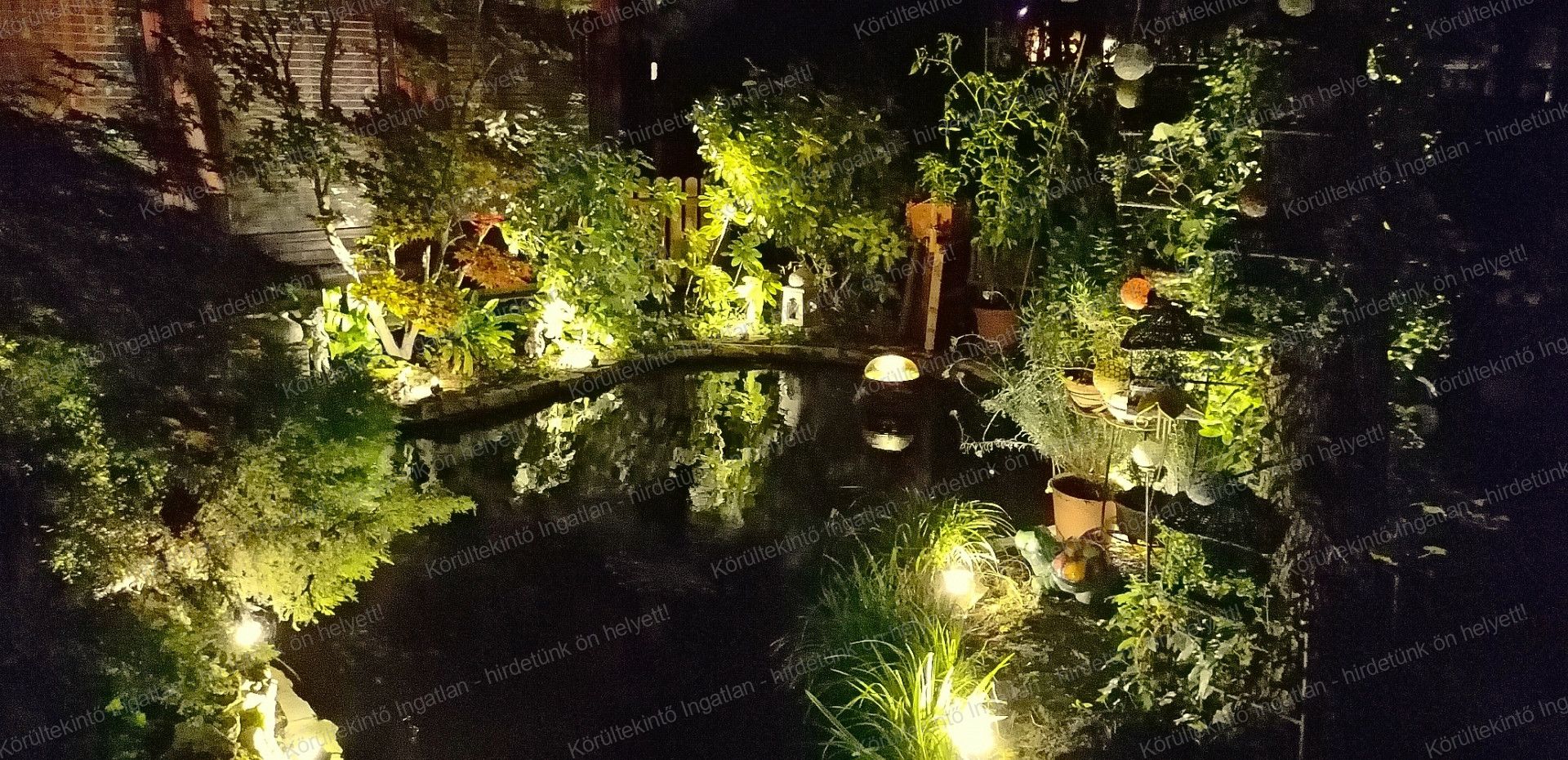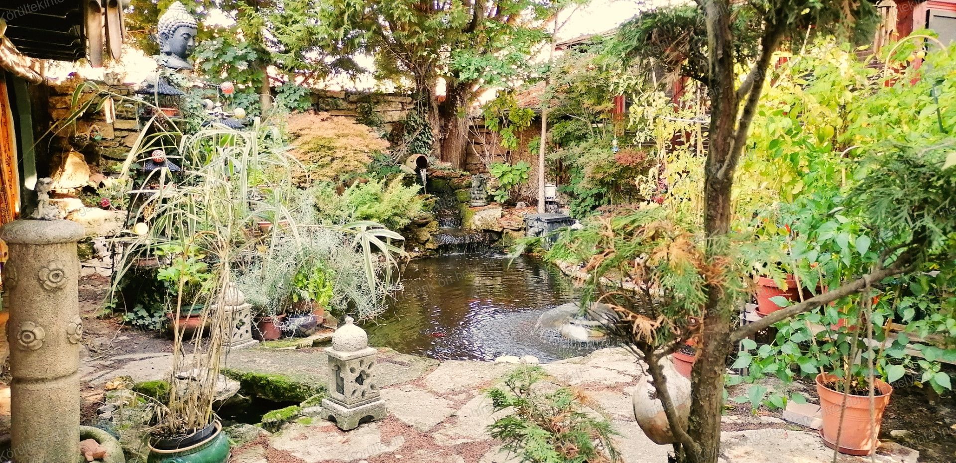 - A kert olyan, mint egy erdei patakmeder, kis tóval, két kis csobogó patakkal, teljes automatikával, 30 éves fákkal, kialakítása miatt egyedi élővilága és hőmérséklet-levegő szűrési képessége van.