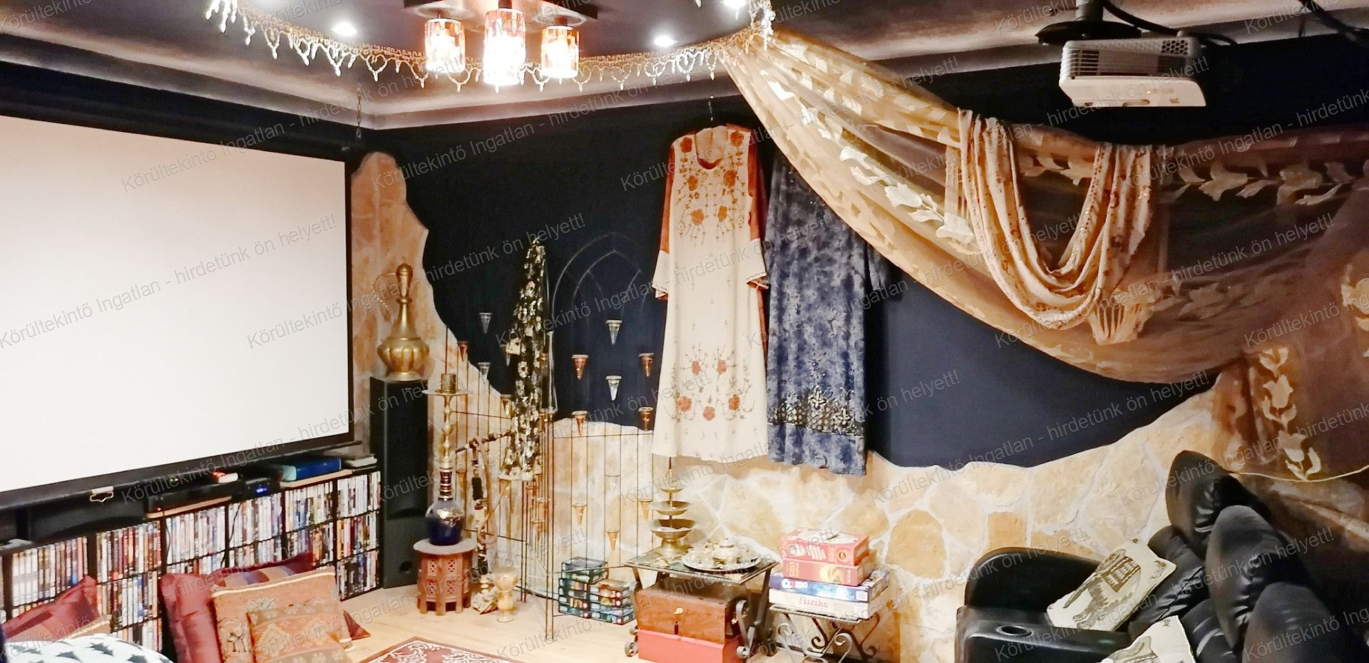 A hátsó lakrész kb. 250 nm hasznos lakóterületű, szintén belső két szintes, nappali + 5 hálószobás (ebből az egyik jelenleg is moziszoba), valamint konyha-étkező, két fürdő, továbbá gardrób került kialakításra.