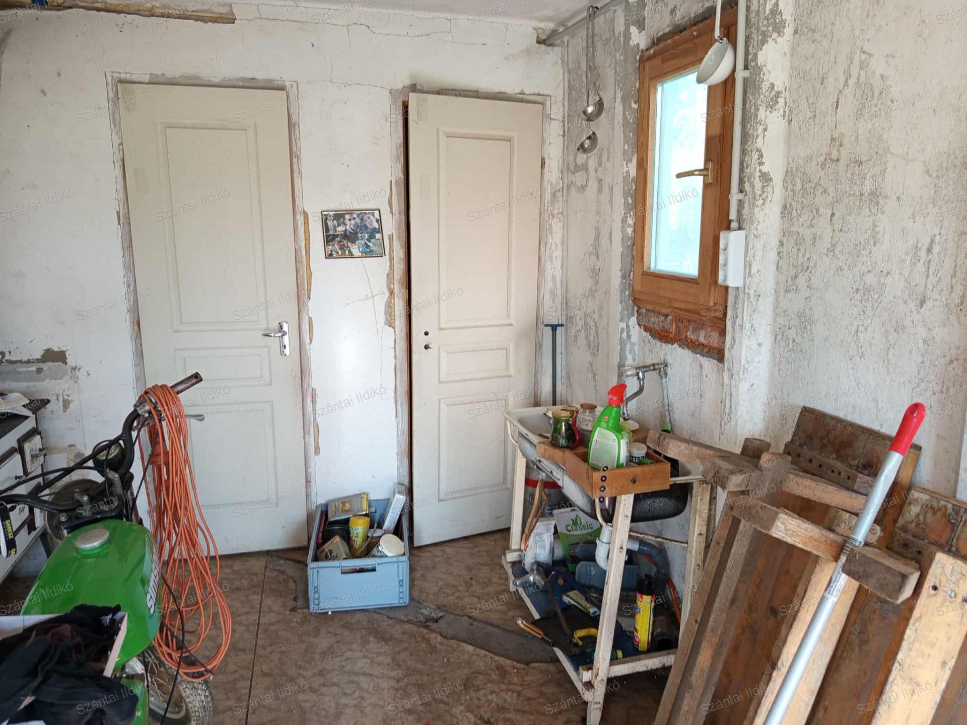 A felső szinten található a hálószoba ( 15m2) , lenn pedig egy kis előtérből nyílik a konyha (9m2), amelyből pedig egy kamra ( 3m2) és még külön a wc és egy kézmosó egyben (3m2). A kamrából kialakítható egy csikos kis zuhanyzó. A konyhában kandallő beépíthető.