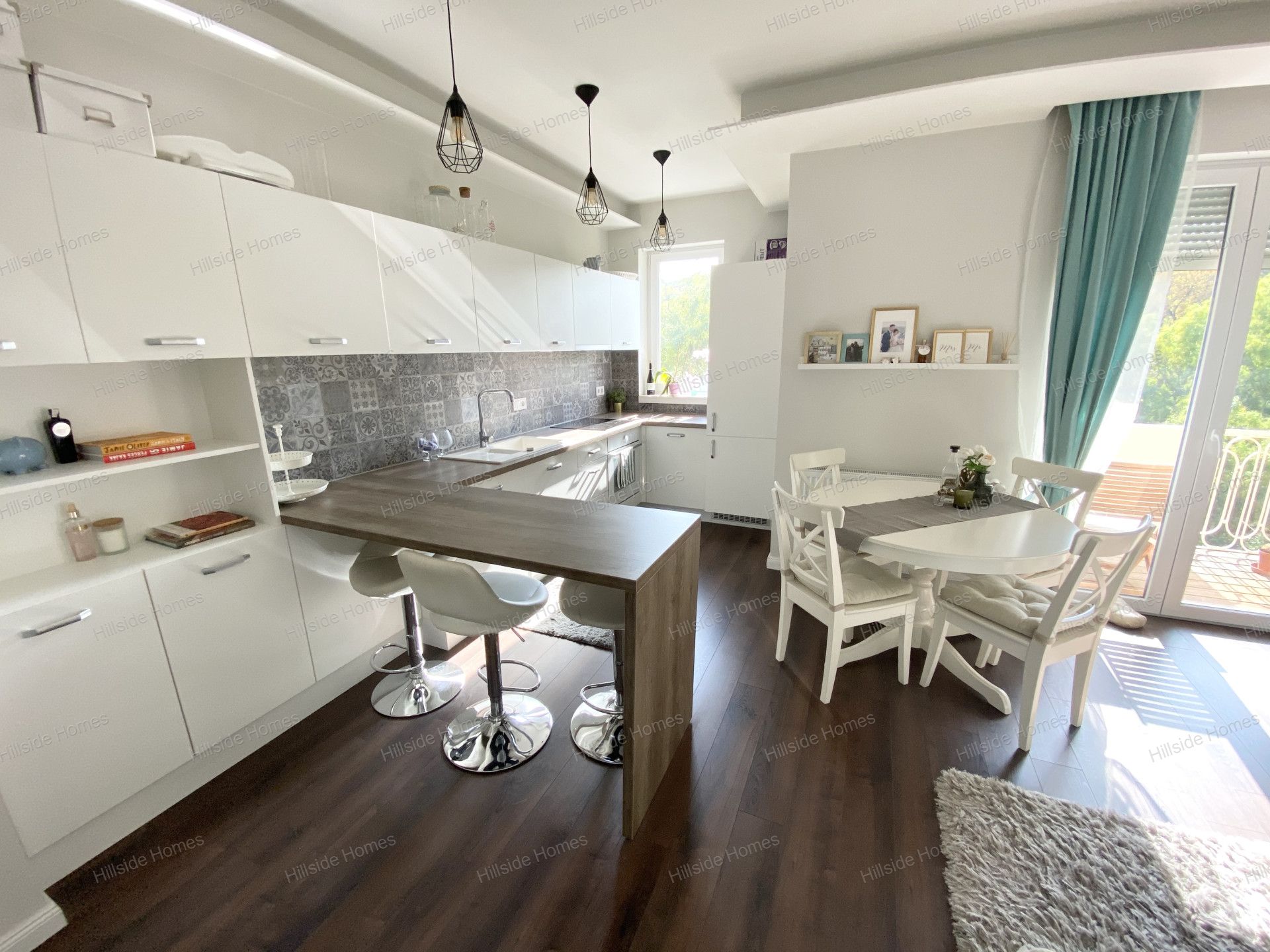 A lakást modern, letisztult stílus jellemzi, melyet egységesen magas minőségű anyaghasználat és átgondolt térkialakítás tesz teljessé. Az előszobából nyílik a kádas fürdőszoba wc-vel, mosdóval és mosógéppel, valamint egy külön gardrób helyiség, amely praktikus tárolási lehetőséget biztosít. A lakás központi tere a rendkívül világos, déli fekvésű amerikai konyhás nappali, amelyből a panorámás terasz is megközelíthető, így a nappali és a kültéri tér egész nap fényben úszik. A nappalin áthaladva érjük el a közel 20 m²-es tágas hálószobát, amely jóval nagyobb a környéken megszokottnál, és beépített, belső világítással ellátott gardróbszekrénnyel biztosít bőséges pakolóhelyet. A konyha igényesen kialakított és prémium gépekkel felszerelt, így minden részlet a kényelmet szolgálja.
