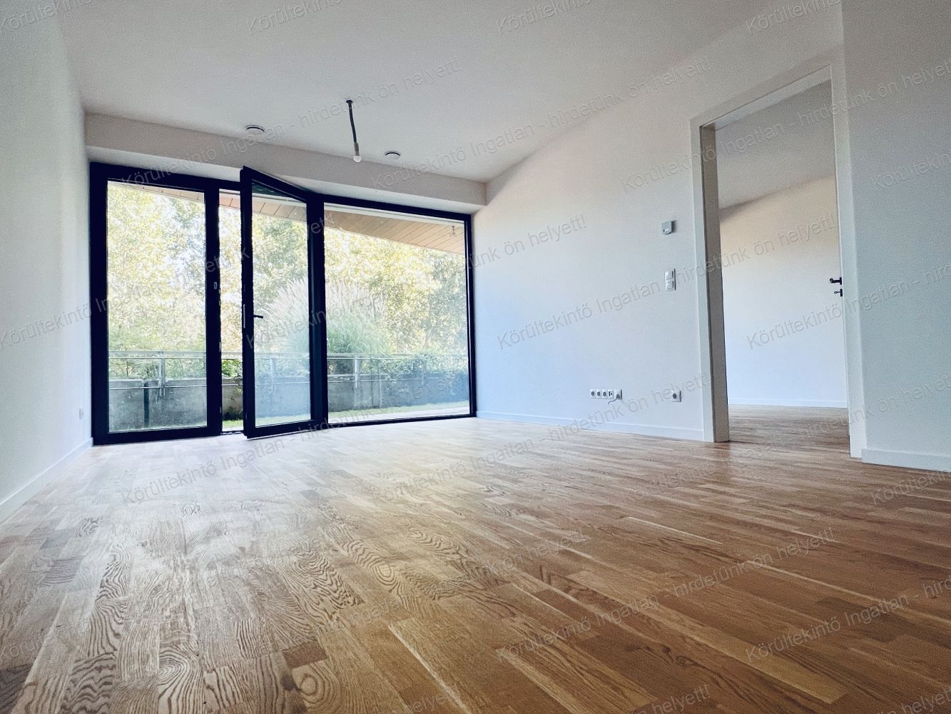 A lakás az épület keleti oldalán és egyben a legcsendesebb részén helyezkedik el, a kertkapcsolat révén bruttó 74 m2 területű életteret biztosít: