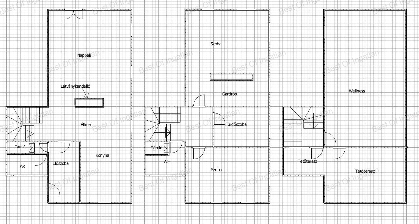 - tetőtérben: tetőterasz, jelenleg wellnes-részként használják, de kis ráfordítással, könnyen egy légterű, fürdőkádas hálószobává alakítható