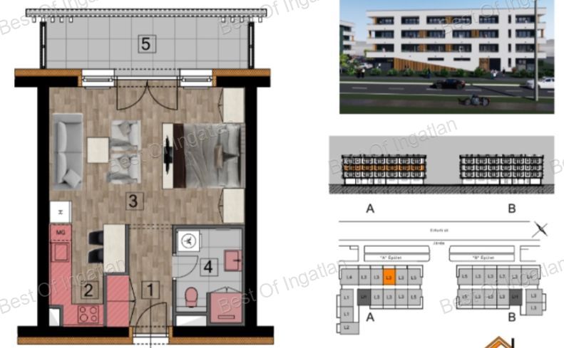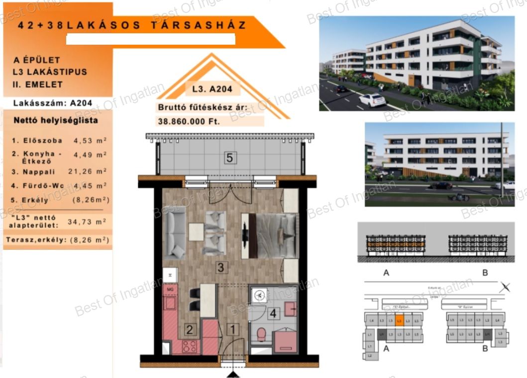 A hirdetésben szereplő L3. típusú, 2. emeleti, erkélyes lakás 34,73 m2 + 8,26 m2 erkély