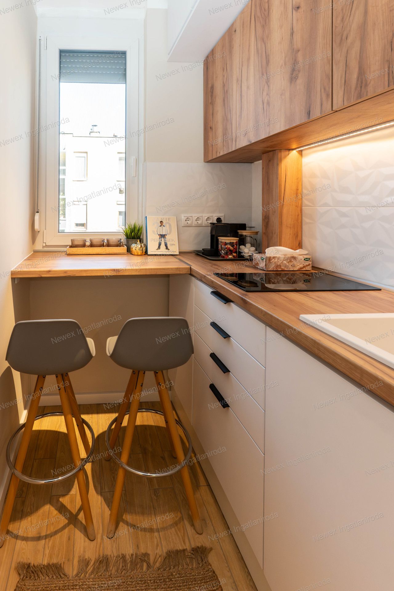 Ebben a felújított modern lakásban, jó elosztásban használhatja a 2 külön hálószekciót, a divatos térelemekkel határolt, de nyitott érzetű nappalit, az igényes zuhanykabinos fürdőszobát, valamint reggeliző sarokkal ellátott, teljesen felszerelt konyhát, az elektromos sütő és főző berendezéseket, a jégadagolós hűtőt, mely a külön nyíló kamrában került elrejtésre.
