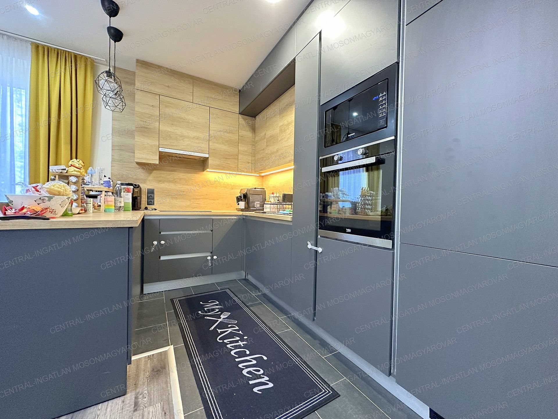 - A lakásba sok beépített bútort található. Mindkét hálószobában teljes falfelületen gardróbszekrény készült. A konyhabútor is nagyobb méretű, U alakú, mennyezetig érő. Beépített gépek: hőlégkeveréses sütő, kerámia főzőlap, páraelszívó, mosogatógép, fagyasztós kombi hűtő, mikrosütő.