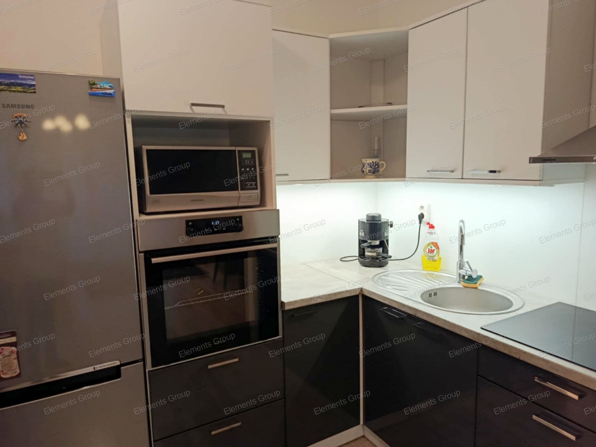 - amerikai konyha, nappali, magasfényű konyhabútor, villany tűzhely
