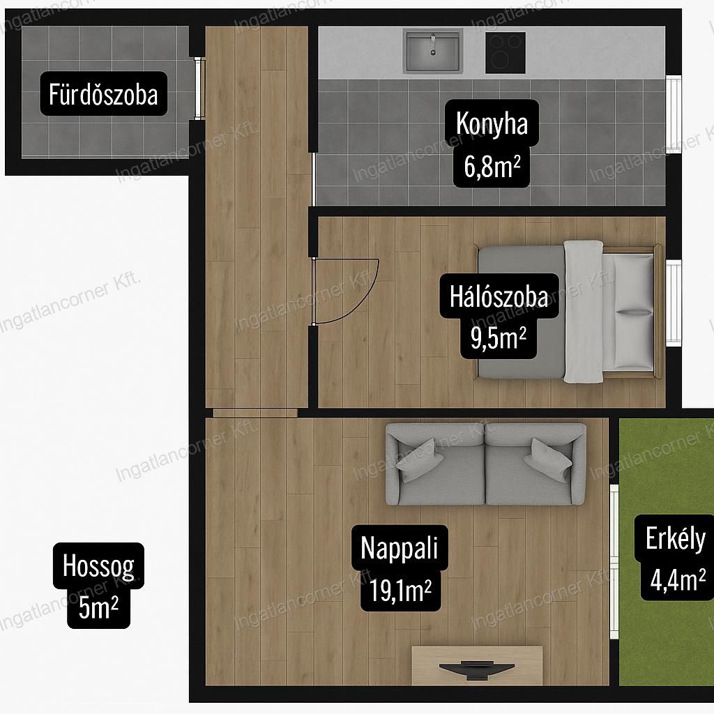 Előtér | Konyha | Fürdőszoba | Hálószoba | Nappali | Erkély (4 m², fedett, kertre néző)